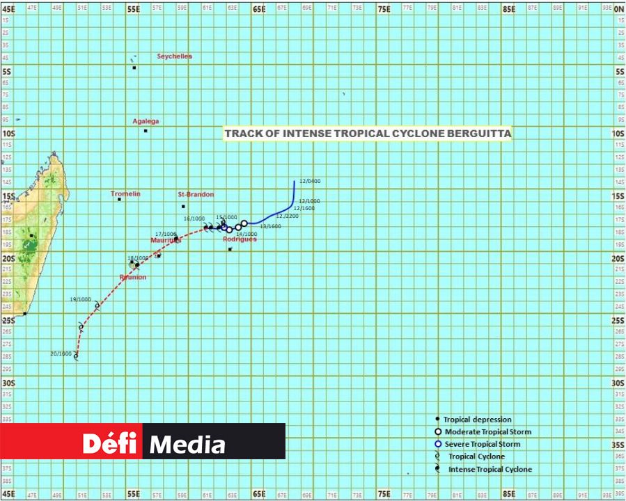 Si le cyclone intense Berguitta maintient son déplacement vers l'ouest-sud-ouest, il passera très près de la côte nord-ouest de Maurice le mercredi 17 janvier, comme indiqué sur l'image satellite publiée sur le site de la station météorologique de Vacoas ce mardi. Selon la presse internationale, Berguitta devrait passer à son point le plus rapproché de Maurice dans la nuit du mercredi 17 janvier.
