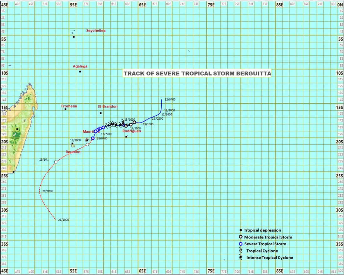Selon la station météorologique de Vacoas, la forte tempête tropicale Berguitta passera à son point le plus rapproché de Maurice, à 20-25 km de la côte de Blue-Bay, vers 8 heures ce jeudi 18 janvier.
