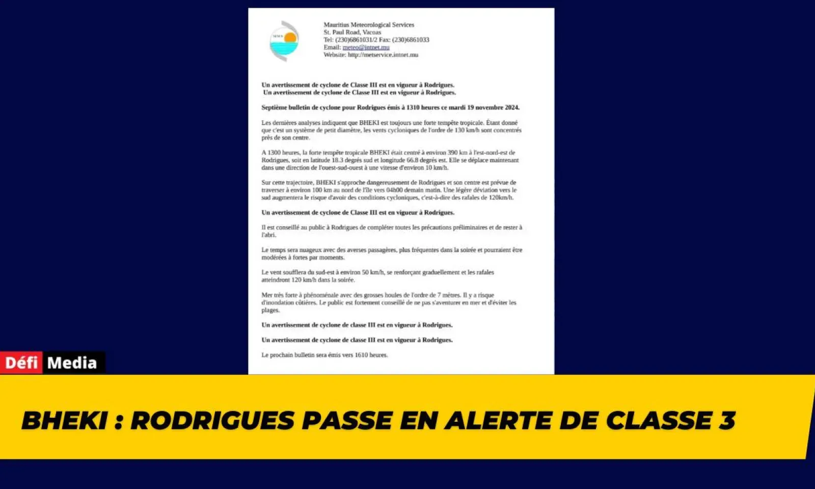 Un avertissement de cyclone de classe 3 est en vigueur à Rodrigues. Les dernières analyses confirment que Bheki reste une forte tempête tropicale. C’est ce qui ressort du septième bulletin cyclonique pour Rodrigues, émis à 13 h 10 ce mardi.