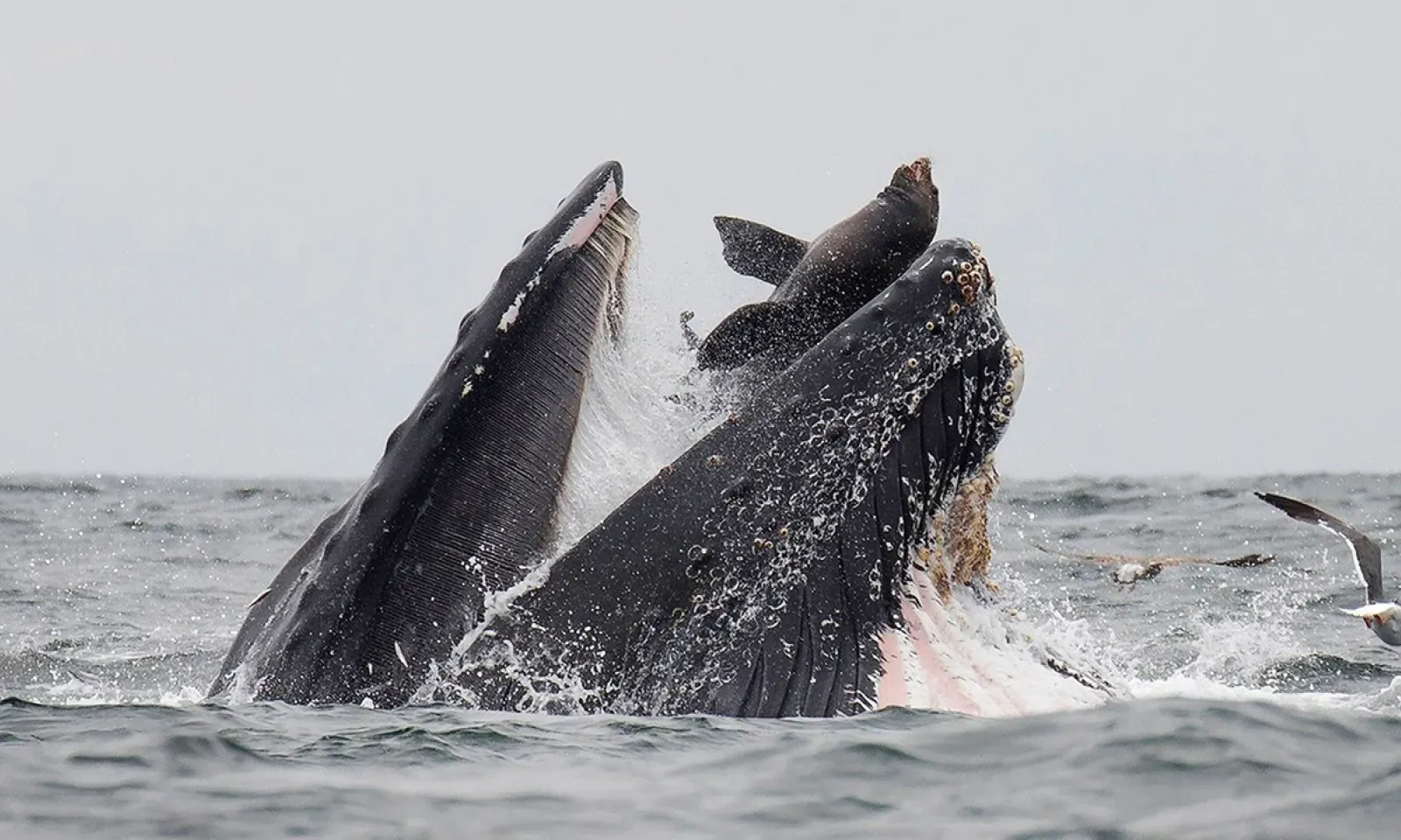 La photo d’une otarie tombant accidentellement dans la gueule grande ouverte d'une baleine à bosse a été prise juste à temps par un biologiste photographe. Chase Dekker a pris cette photo, il y a quelques jours, depuis un bateau pendant une expédition d'observation des baleines dans le Pacifique, au large de la baie de Monterey, en Californie.