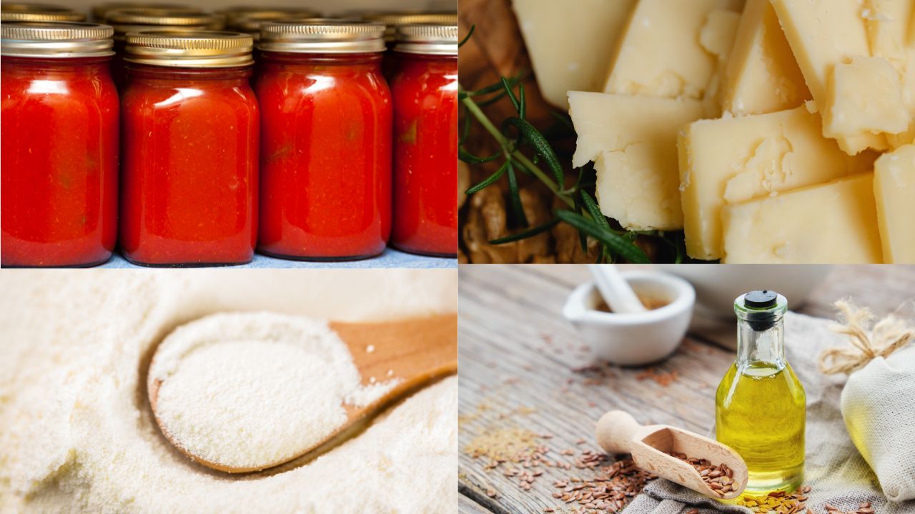 Soulignons que ces sept produits sont des boîtes de conserve (pilchard et sardines), les tomates en conserve, le fromage, l'huile comestible, la margarine, le lait en poudre et les grains secs.