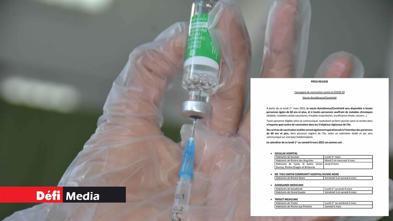 Le ministère de la Santé, dans un communiqué émis vendredi 26 février, informe le public qu’à partir de ce lundi 1er mars 2021, le vaccin AstraZeneca/Covishield sera disponible à toutes personnes âgées de 60 ans et plus, et à toutes personnes souffrant de maladies chroniques (diabète, maladies cardio-vasculaires, troubles respiratoires, insuffisance rénale, cancers…)