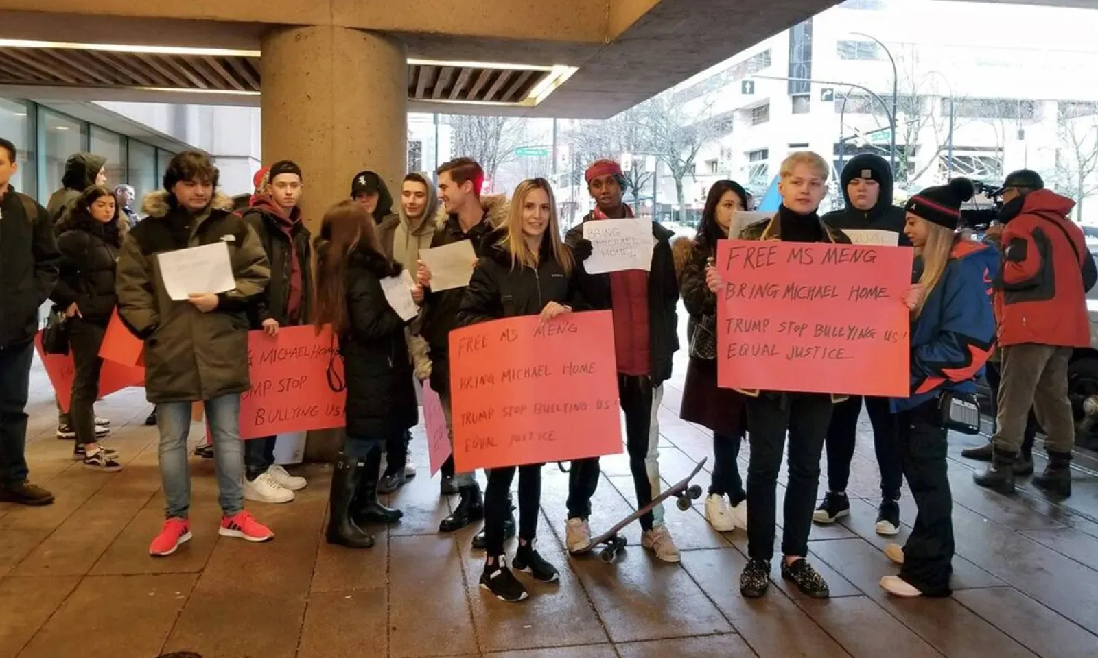 «Libérez Meng, Justice équitable !» : pouvait-on lire sur une pancarte. «Trump arrête de nous harceler», clamait une autre.