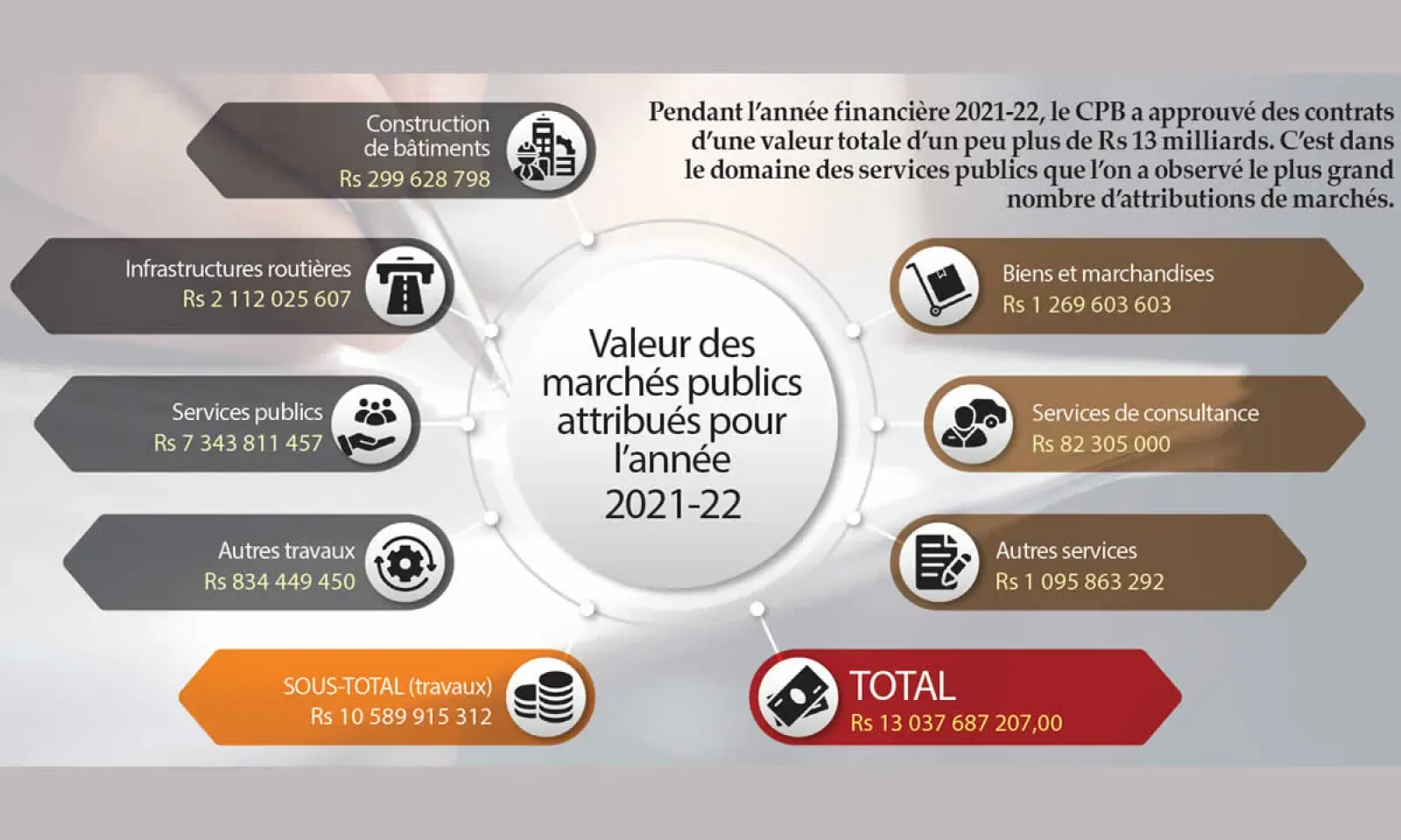 Pendant l’année financière 2021-22, le CPB a approuvé des contrats d’une valeur totale d’un peu plus de Rs 13 milliards. C’est dans le domaine des services publics que l’on a observé le plus grand nombre d’attributions de marchés.