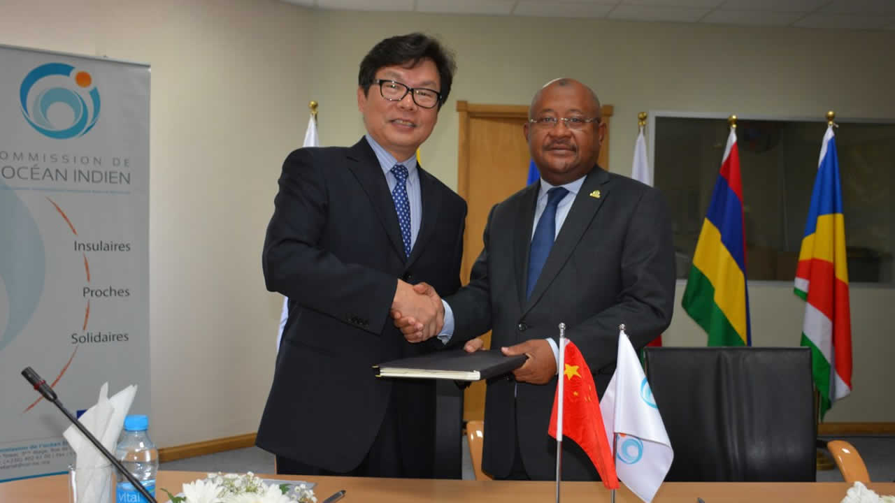 L’Ambassadeur de la République populaire de Chine à Maurice, Sun Gongyi, et le Secrétaire général de la Commission de l’océan Indien, Madi Hamada, ont signé l’accord de don au siège de l’organisation régionale le 31 octobre 2017.