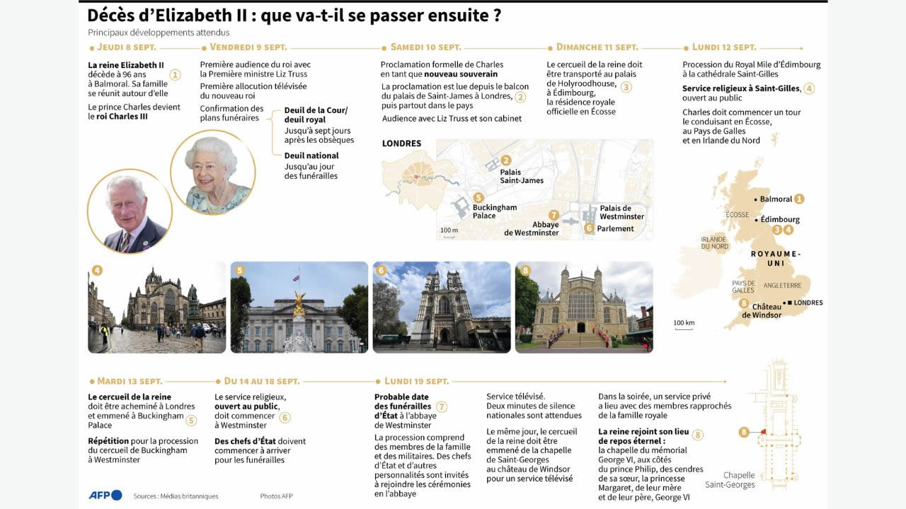 Chronologie des principaux développements attendus dans les prochains jours autour des funérailles d'Elizabeth II et de l'accession au trône de Charles