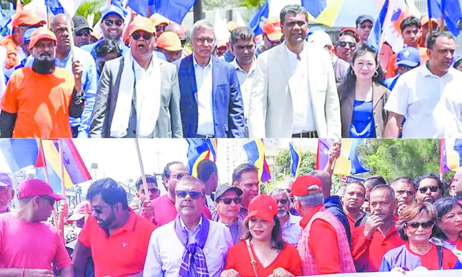 Du côté de l’Alliance Lepep, c’est vers midi trente que leurs partisans ont entamé leur défilé, partant du centre de Quatre-Bornes. Le contraste avec les autres blocs politiques était frappant, tant en termes de banderoles que de mobilisation de partisans. Plus d’une centaine de sympathisants s’étaient rassemblés pour marquer une démonstration de force et afficher leur soutien inébranlable aux trois candidats de l’alliance : Kavy Ramano, Xavier-Luc Duval et Shyam Khemloliva.