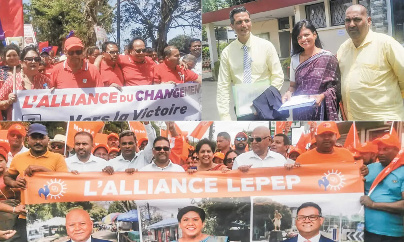 Les candidats de l’Alliance Lepep ont été les premiers des deux principaux blocs à se regrouper avec leurs sympathisants à Piton pour se diriger au centre social pour faire acte de candidature. Ravi Yerrigadoo, Leela Devi Dookhun Luchoomun et Mahen Jhugroo, sous les sons de tambours, alors que d’autres supporteurs, brandissant des pavillons du MSM, avançaient en scandant : « 1, 2, 3 zero pisso ». Avec le sourire, ils ont pénétré dans la cour du centre social pour s’enregistrer.