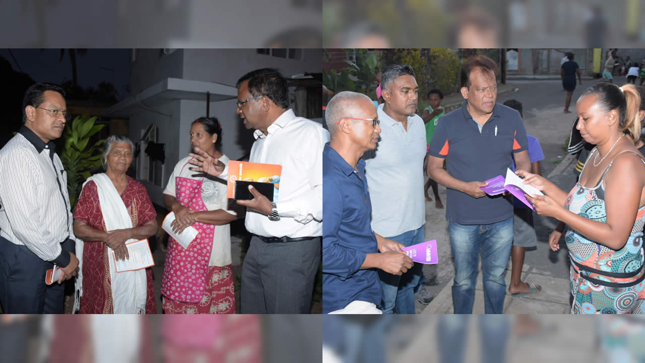 Les candidats de la circonscription No 5, sous la bannière de l’Alliance Morisien et du Mouvement Militant Mauricien, étaient à pied d’œuvre dans l’après-midi du vendredi 18 octobre à Terre-Rouge, soit dans la région de la NHDC Camp Laboue et à la Résidence Nelson Mandela. Une distribution de pamphlets, contenant le programme électoral de chacun des deux parties, a eu lieu lors des visites aux domiciles des habitants.