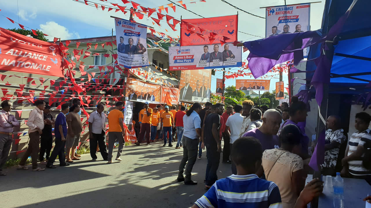 Il est 16 heures. À l’entrée de Nehru Road, Lallmatie : trois bases. Une de l’Alliance Nationale, une autre de l’Alliance Morisien et une autre du Mouvement militant mauricien. À deux heures de la fermeture des centres de vote, l’effervescence a atteint son paroxysme. Les pétarades dans le camp orange concurrencent celles des mauves. Voitures et vans qu’alimente la route principale traversant Lallmatie s’arrêtent à leur base pour prendre des directives de leurs agents respectifs.
