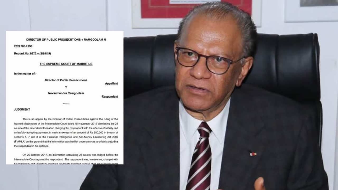 Navin Ramgoolam était poursuivi sous 23 accusations de « limitation of payment in cash » en Cour intermédiaire. Cela, pour avoir accepté Rs 63, 8 millions en espèces en six ans, soit du 31 janvier 2009 au 7 février 2015. Le 15 novembre 2019, la Cour intermédiaire avait rayé les accusations. Le DPP avait interjeté appel.