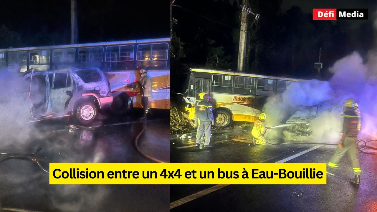 Un accident de la route impliquant un 4x4 et un bus s'est produit à Eau-Bouillie, un village situé entre Nouvelle-Découverte et Les Mariannes, en début de soirée ce mardi. Selon nos informations, aucun blessé n'est à déplorer. Les occupants du 4x4 avaient déjà pris la fuite à l'arrivée des pompiers des casernes de Quatre-Bornes. Le 4x4 a pris feu après l'impact.