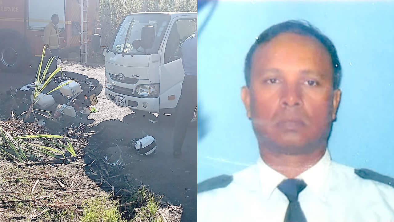 Un grave accident de la route s’est produit à Fuel, Flacq, dans la matinée du jeudi 1ᵉr août 2024. Le sergent Vidya Kumar Jadoo, 55 ans, a été percuté par une camionnette. Ce motard de la Traffic Branch, rattaché au bureau du vice-président de la République, est mort sur le coup. Le chauffeur a été arrêté.