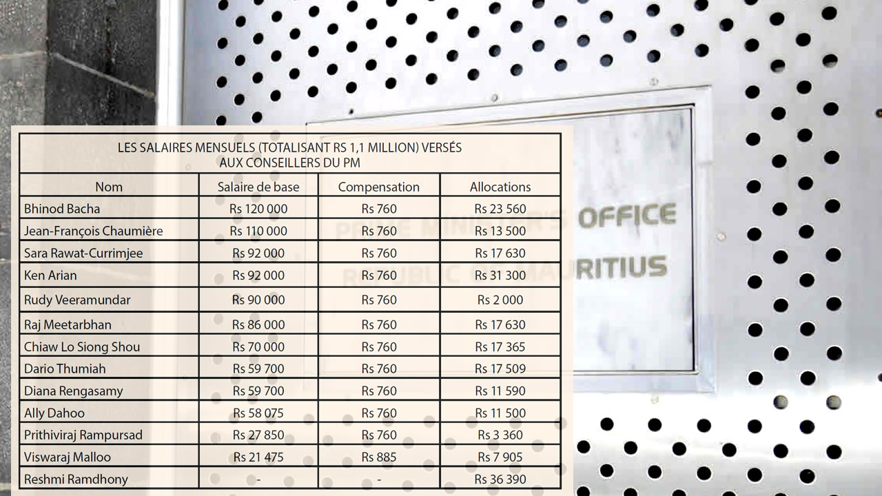| Les salaires mensuels (totalisant Rs 1,1 million) versés aux conseillers du PM | |||