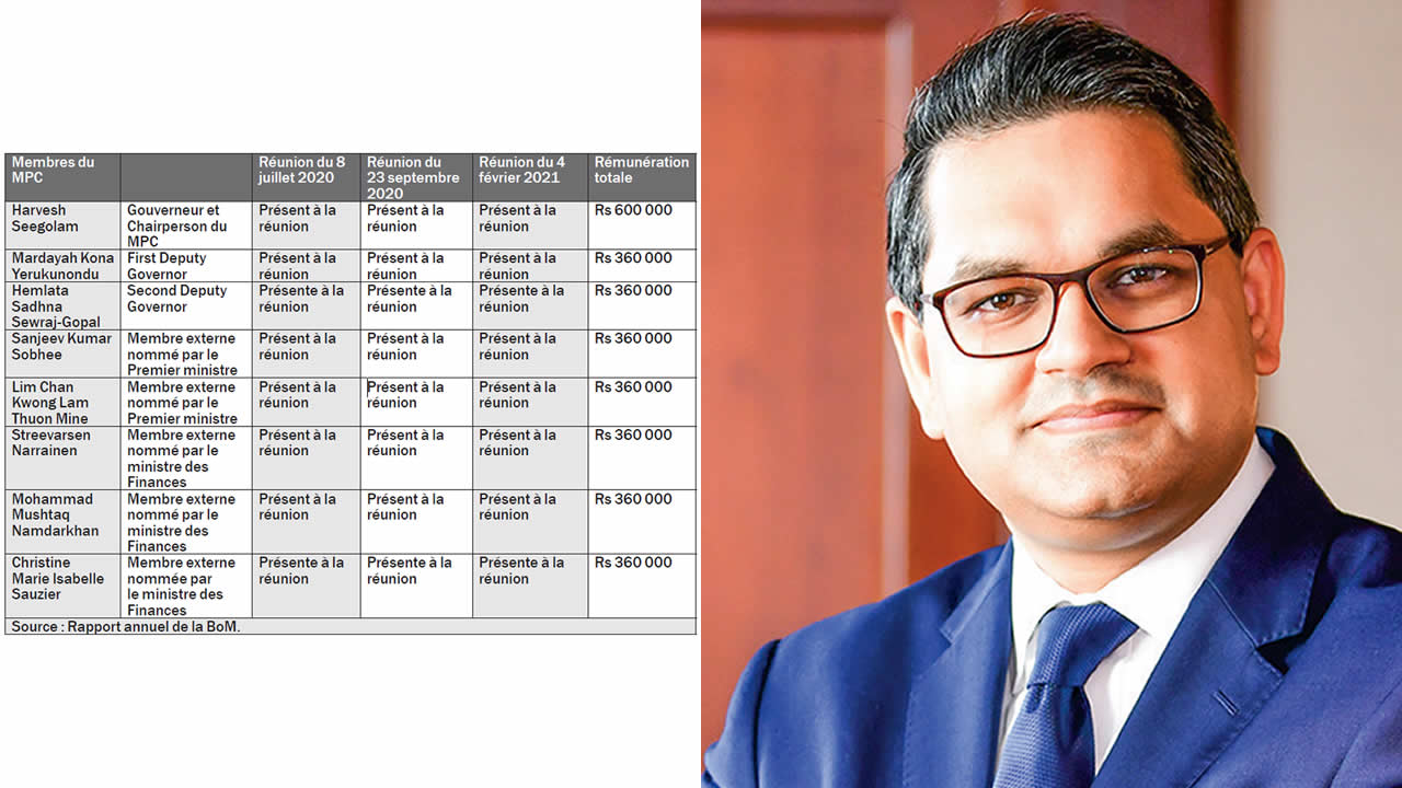 Qui sont les membres du Monetary Policy Committee (MPC) ? Combien touchent-ils ? Il ressort que le gouverneur de la Banque de Maurice, Harvesh Seegolam, qui préside le comité, touche Rs 200 000 par réunion. Quant aux autres membres du comité, ils perçoivent Rs 120 000, chacun, par réunion. À savoir que le comité décide de l’orientation de la politique monétaire en augmentant,