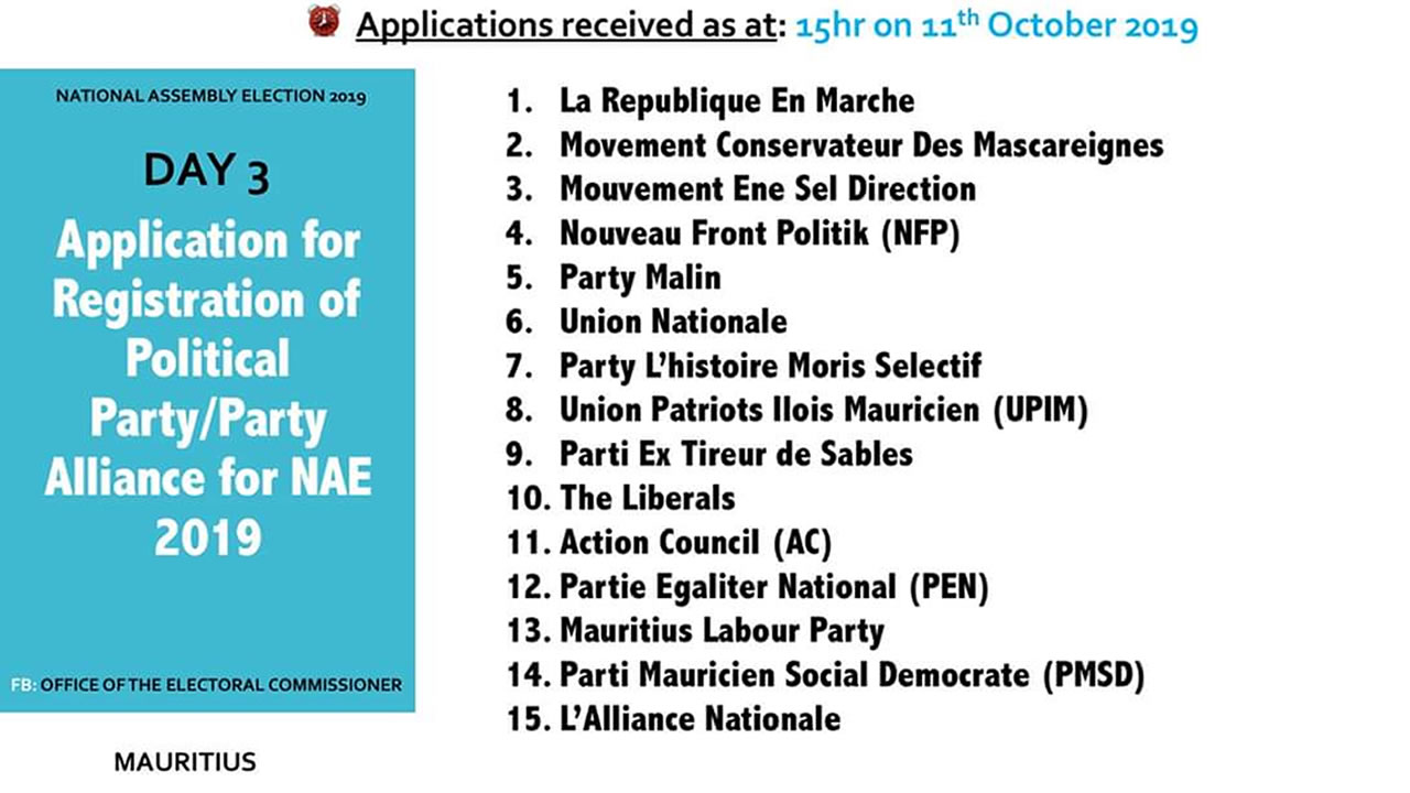 15 enregistrements ont été reçus. Soit, 14 partis politiques et aussi l’enregistrement de l’Alliance Morisien (MSM/ML).