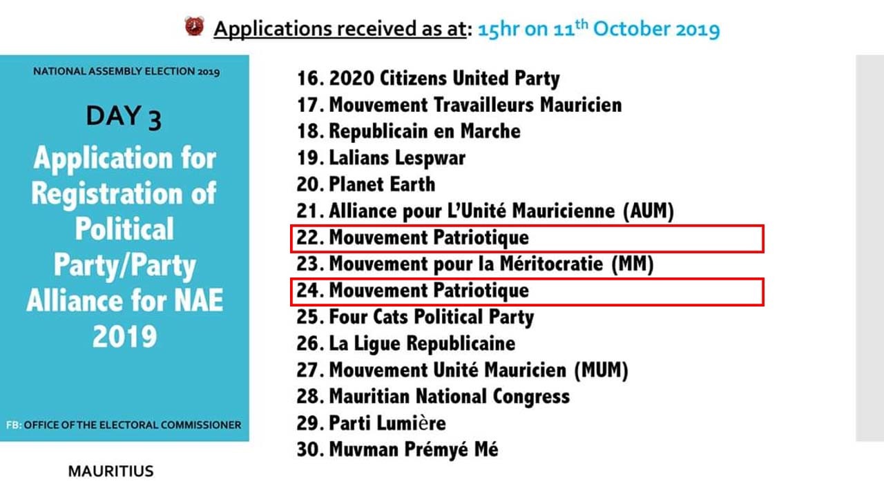Lequel de deux groupes pourra utiliser le nom du «Mouvement Patriotique» et le symbole de la rose ? Il faudra attendre la décision du Commissaire électoral, Irfan Raman qui sera connu lors d’un point de presse, le samedi 12 octobre. Il officialisera la liste finale des enregistrements des partis politiques et des alliances en marge des élections législatives 2019.