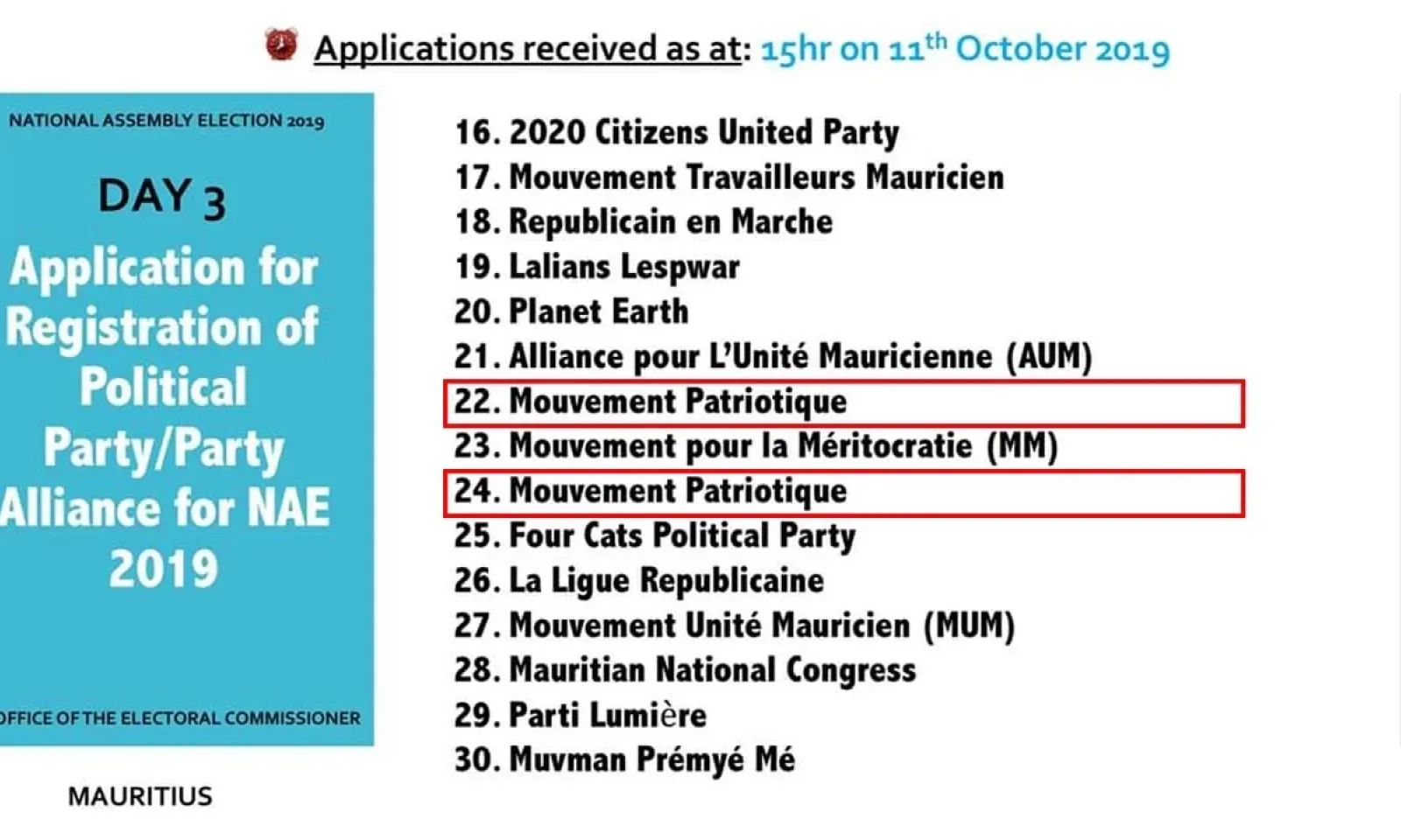Pour rappel, les deux groupes (le tandem Jean-Claude Barbier et Atma Bumma d'un côté et le clan Alan Ganoo de l'autre) qui revendiquent tous les deux la paternité du nom et des symboles du Mouvement Patriotique ont rempli leurs formalités à l'Electoral Supervisory Commission (ESC).