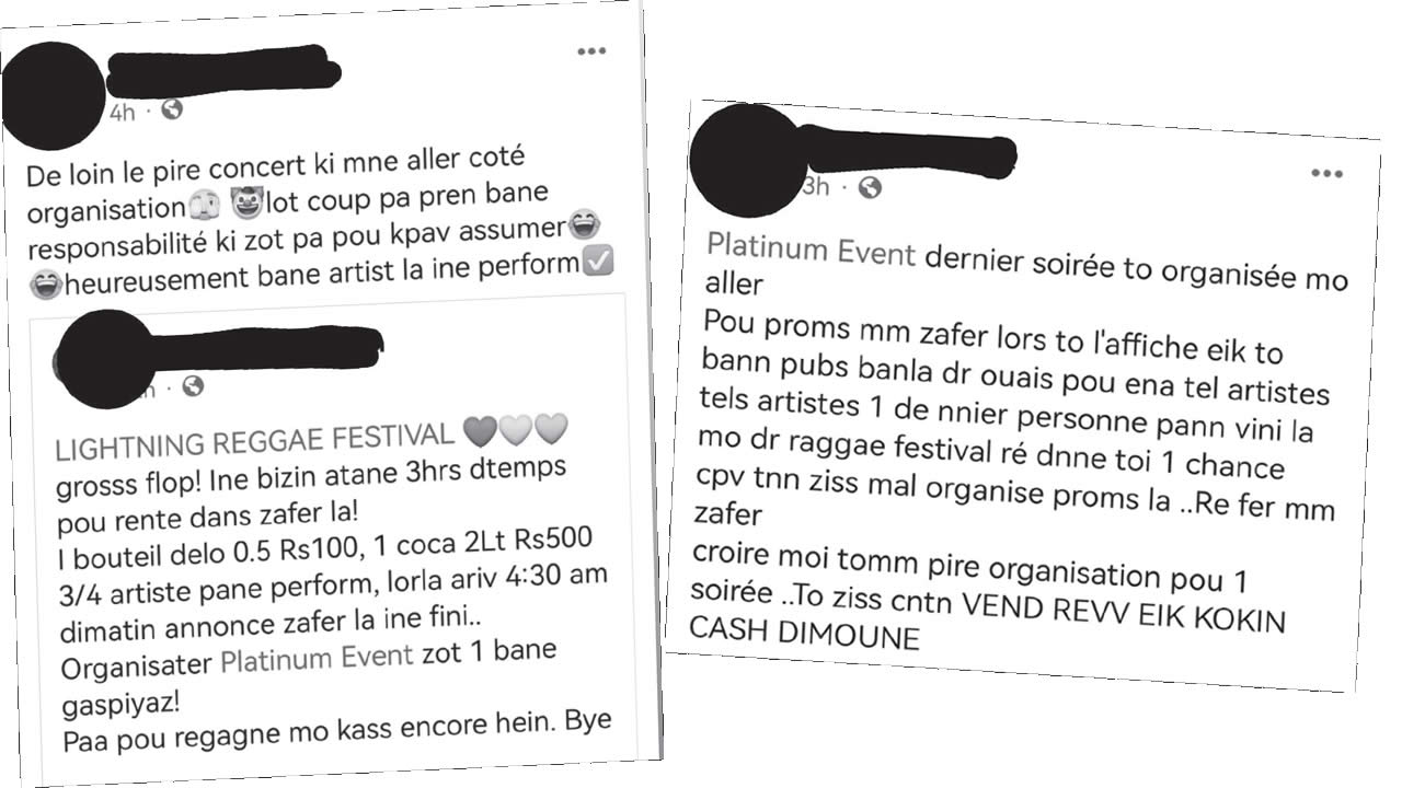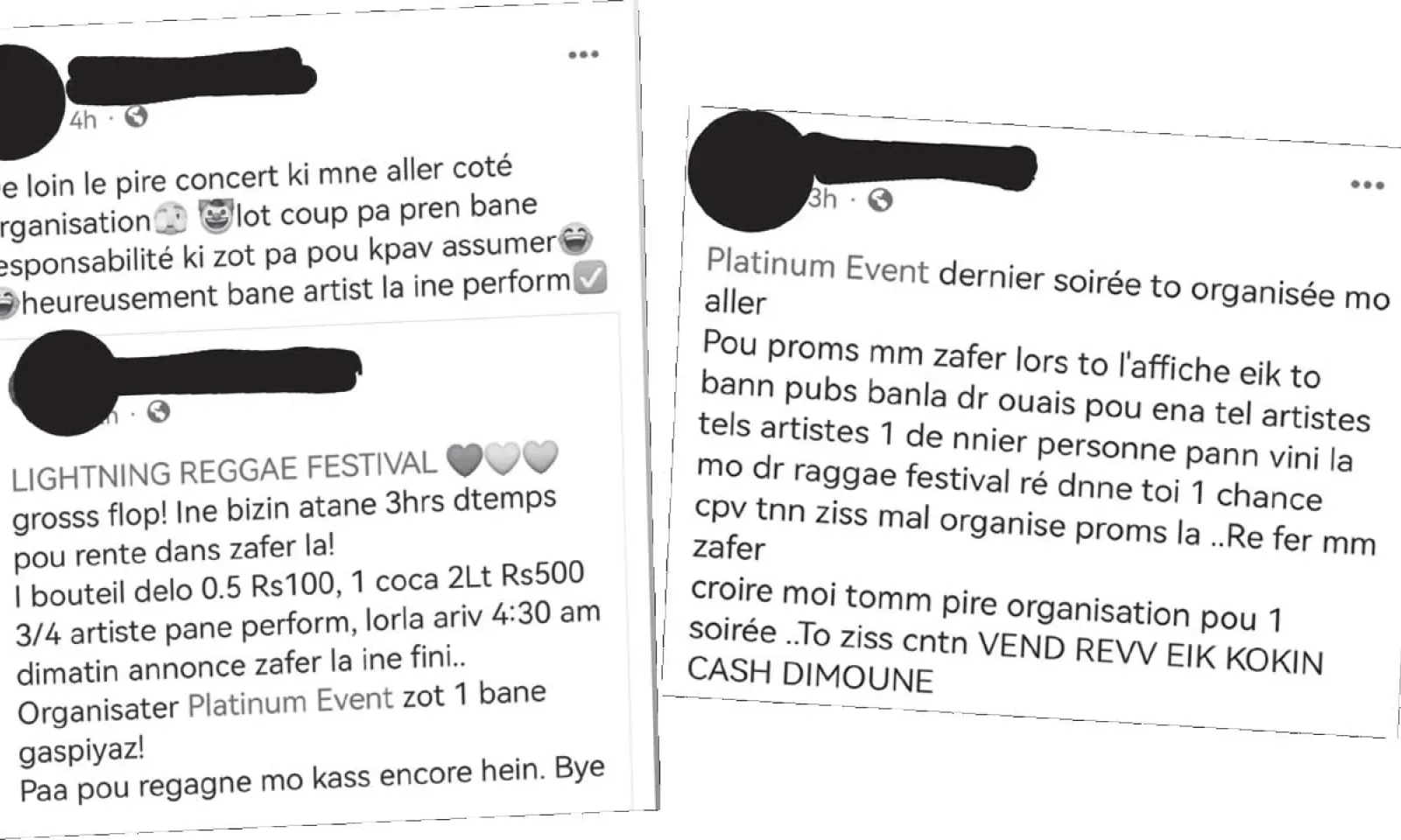 Les critiques pleuvent sur les réseaux sociaux depuis dimanche matin. Le concert Lightning Reggae Festival tenu au Green Village, au Morne n’a pas fait des heureux. Ceux qui l’ont assisté mettent en avant plusieurs manquements de l’organisateur qui est Platinum Events.