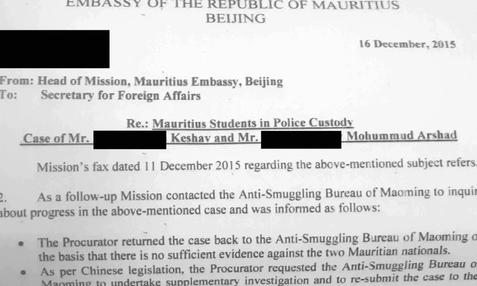 Un document en date du 16 décembre 2015, émis par l’ambassade mauricienne à Beijing, indique qu’il n’y avait pas de preuves suffisantes pour incriminer Arshad et Keshav et que la brigade anti-drogue devait poursuivre son enquête. Voici ce qu’on peut y lire : « As a follow-up Mission contacted the Anti Smuggling Bureau of Maoming to inquire about progress in the above mentioned case and was informed as follows. The prosecutor returned the case back to the Anti smuggling bureau of Maoming on the basis that there is no sufficient evidence against the two Mauritian nationals. »