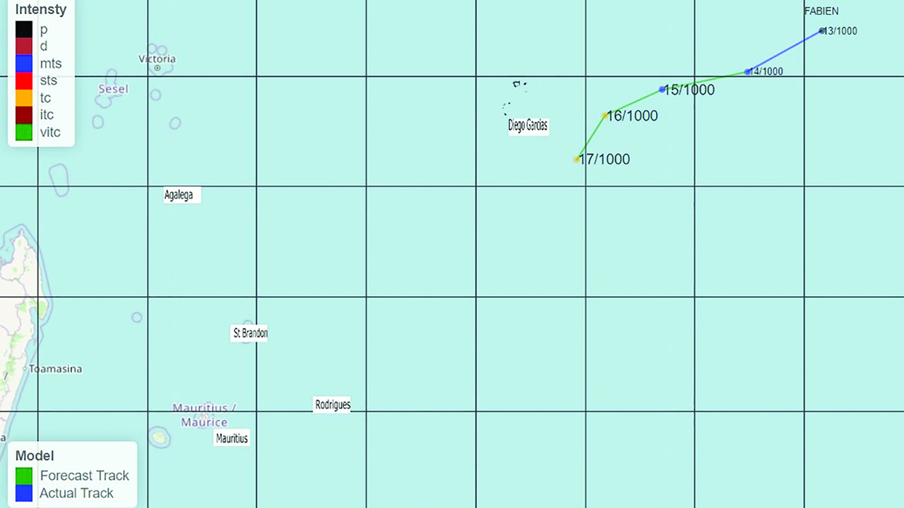 Actuellement, c’est la tempête tropicale modérée Fabien qui monopolise l’attention des météorologues et prévisionnistes de la station météorologique de Vacoas. Selon les indications, il restera dans le bassin de l’océan Indien pendant au moins une semaine, car les conditions sont favorables à son évolution. Cependant, il semble qu’il restera assez loin des îles des Mascareignes en prenant une trajectoire vers le Sud-Ouest. Bien qu’il s’approche de nous, il est prévu qu’il passera au Nord de St Brandon dans les prochains jours, tout en s’affaiblissant au fil du temps, selon Ram Dhurmea.