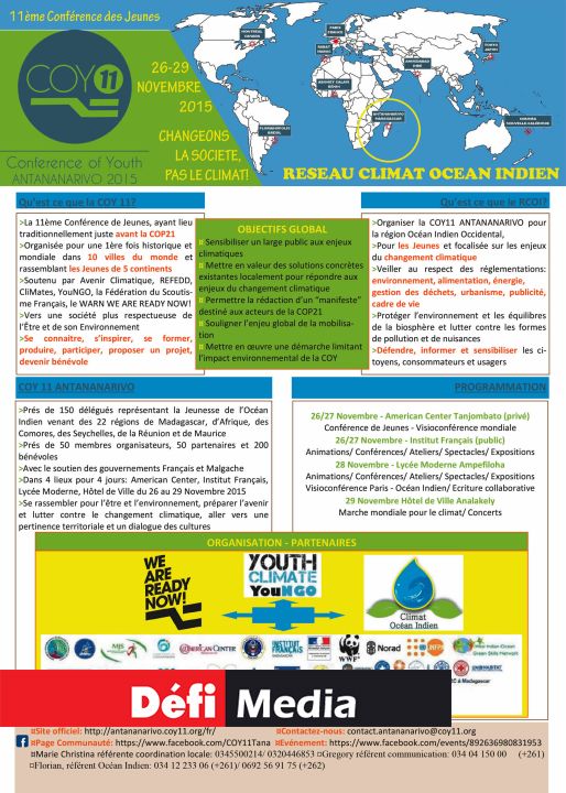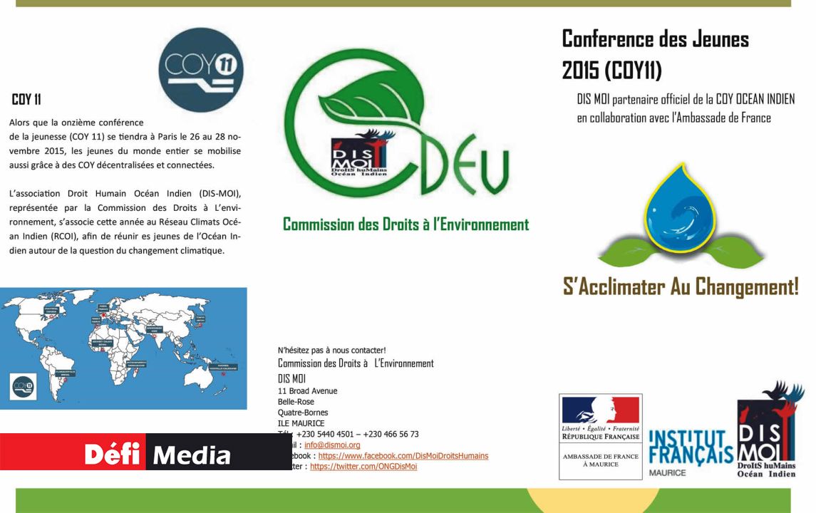 Aussi, afin de permettre aux jeunes mauriciens de se mobiliser autour des enjeux climatiques, DIS-MOI en partenariat avec l’ambassade de France, organiseront le lundi 30 novembre une conférence des jeunes à l’Institut Français de l’île Maurice. Soutenue par diverses ONG, telles que Roches-Noires Eco Marine, FORENA, MOVE, La Green Building Council of Mauritius et la Sustainable Agriculture Organisation, cette journée d’activités se déroulera de 13 à 16 heures et permettra aux jeunes de participer à des débats et de s’exprimer tant sur les thèmes régionaux que mondiaux. [padding-p-1 custom_class=""][/padding-p-1] [[{"type":"media","view_mode":"media_large","fid":"5127","attributes":{"class":"media-image aligncenter wp-image-8553 size-full","typeof":"foaf:Image","style":"","width":"1920","height":"1207","alt":"Conference des Jeunes 2015 (COY11)"}}]] [[{"type":"media","view_mode":"media_large","fid":"5128","attributes":{"class":"media-image aligncenter size-full wp-image-8555","typeof":"foaf:Image","style":"","width":"1920","height":"2687","alt":"COP21"}}]]La journaliste Dzamara disparue