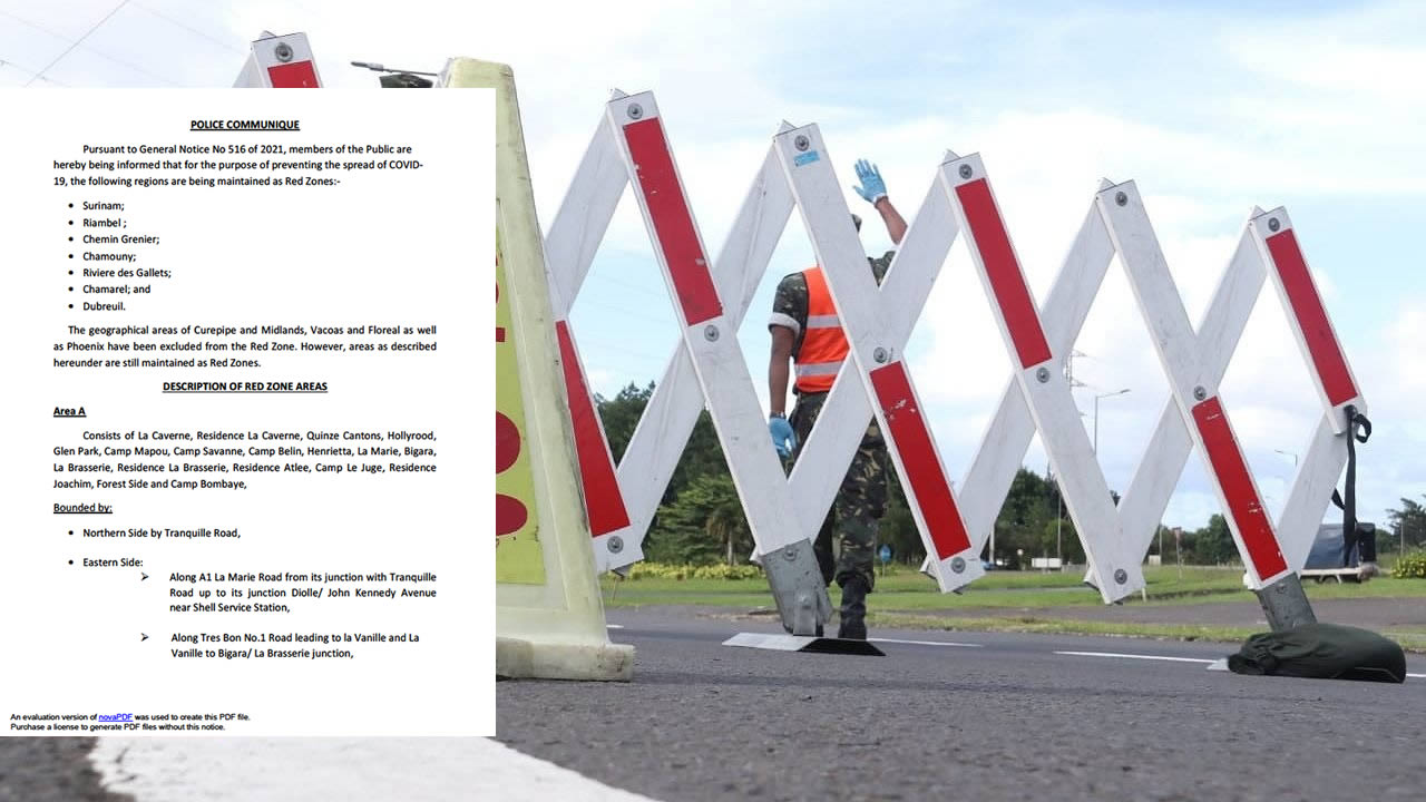Le Commissaire de Police rappelle que les régions suivantes sont également maintenues en zone rouge : Surinam, Riambel, Chemin-Grenier, Chamouny, Riviere-des-Galets, Chamarel, et Dubreuil.