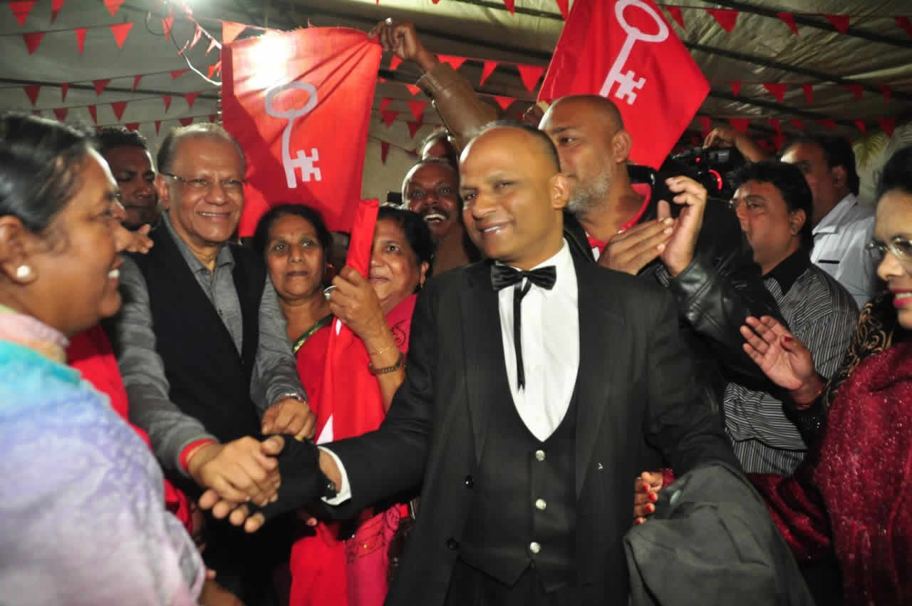 Il s’agit de Dhanrajsingh Aubeeluck, leader du Party Malin. Il est arrivé juste avant Navin Ramgoolam. Ce qui a causé une confusion parmi les orateurs qui croyaient que c'était le leader du PTr qui faisait son entrée.