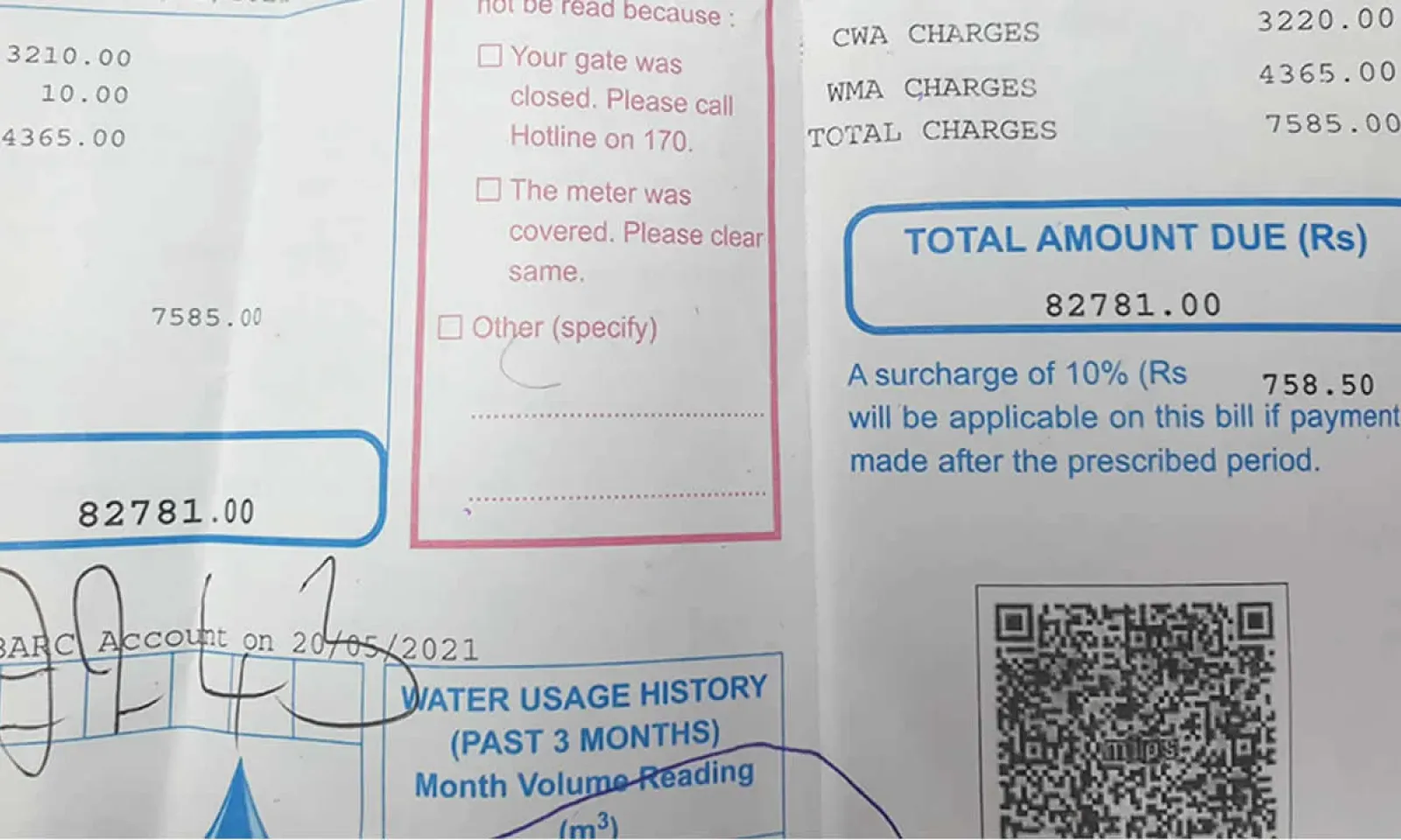 Interrogé à ce sujet, Sunil Gopal, responsable de communication à la CWA, explique que de la somme totale, Rs 47 777 ont été facturées par la Wastewater Management Authority (WMA).La somme qui a été réclamée par la CWA s’élève à Rs 34 938. Selon les relevés, il y a eu une forte consommation d’eau. Comme le meter reader n’avait pas accès à la maison, la décision a été prise d’enlever le compteur afin que d’autres montants ne lui soient pas réclamés. En outre, étant donné qu’elle payait ses factures par Direct Debit, la même somme a été déduite de son compte », déclare le responsable de communication.