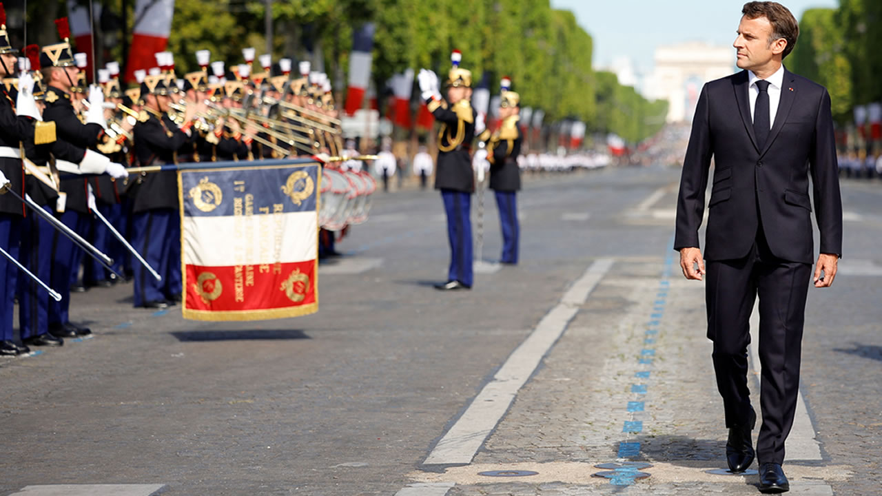 A l'issue du défilé, le chef de l'Etat doit donner à 13h10 sur les chaînes France 2 et TF1 sa première interview télévisée depuis sa réélection en avril, dans un contexte politique intérieur complexe après le revers de sa coalition aux législatives de juin qui l'a privé d'une majorité absolue à l'Assemblée nationale.