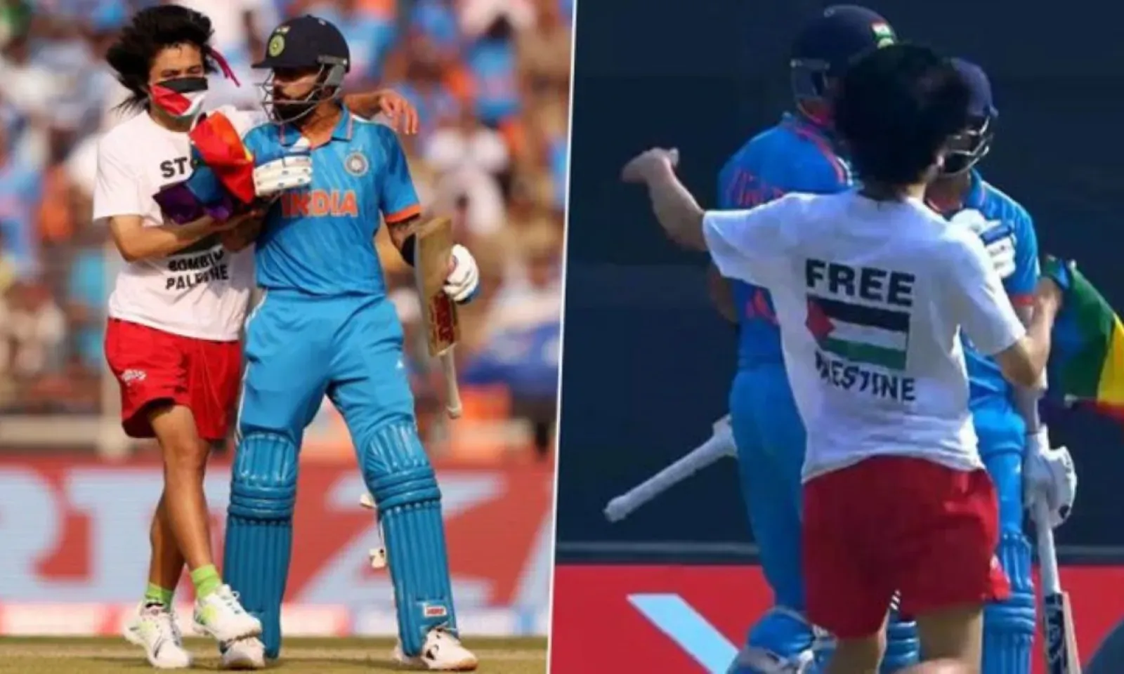 Un militant pro-palestinien a interrompu brièvement la finale de la Coupe du Monde de cricket en Inde dimanche, en parvenant à s'introduire sur le terrain et en étreignant le batteur indien superstar Virat Kohli.