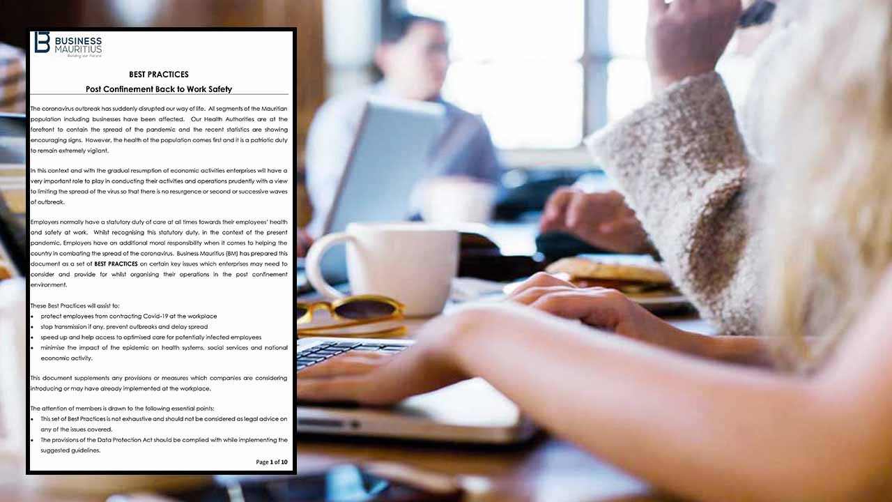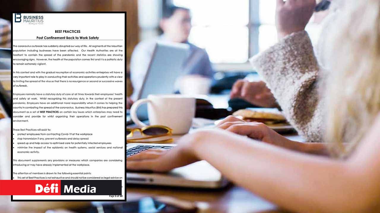 Business Mauritius précise que les employeurs ont normalement une obligation légale de veiller à tout moment à la santé de leurs employés et la sécurité au travail. Dans le contexte actuel et avec le Covid-19, les employeurs ont une responsabilité morale supplémentaire lorsqu'il s'agit d'aider le pays dans la lutte contre la propagation du coronavirus, selon l’organisme.