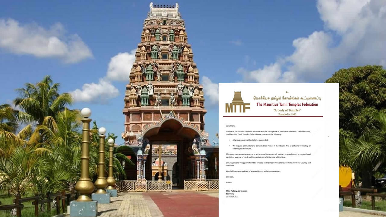 Dans un communiqué émis ce matin, la Mauritius Tamil Temples Federation (MTTF) recommande que les prières en groupe dans les kovils soient suspendues en raison des cas de contamination locale à la Covid-19.