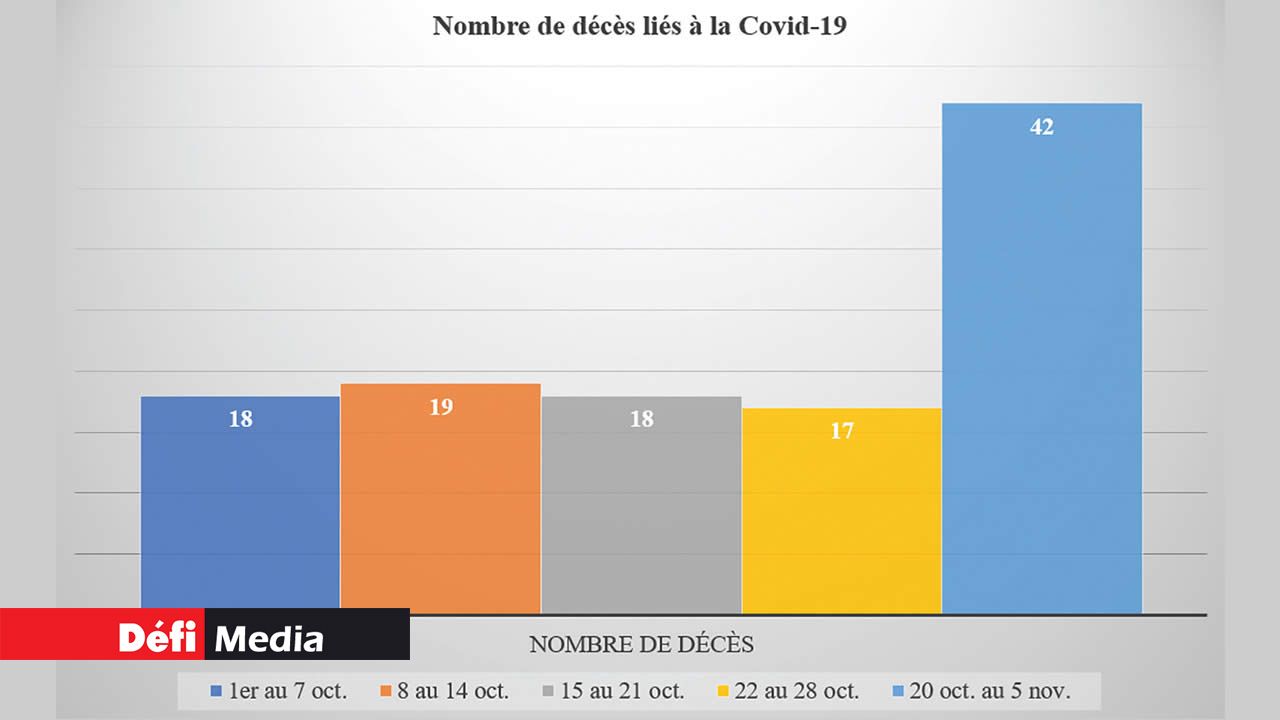 Le nombre de décès liés à la Covid-19 est passé de 17 pour la semaine du 22 au 28 octobre, à 42 pour la semaine du 29 au 5 novembre. Le nombre a ainsi plus que doublé. Avant cela, il a pu être contenu en quarantaine.