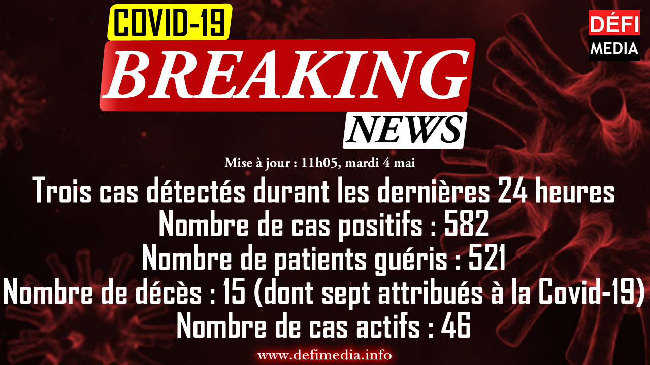 Trois cas de contamination locale à la Covid-19 ont été enregistrés durant les dernières 24 heures, indique un communiqué du ministère de la Santé émis ce mardi matin 4 mai. A savoir que ce sont les mêmes trois cas annoncés tard dans la soirée d’hier.