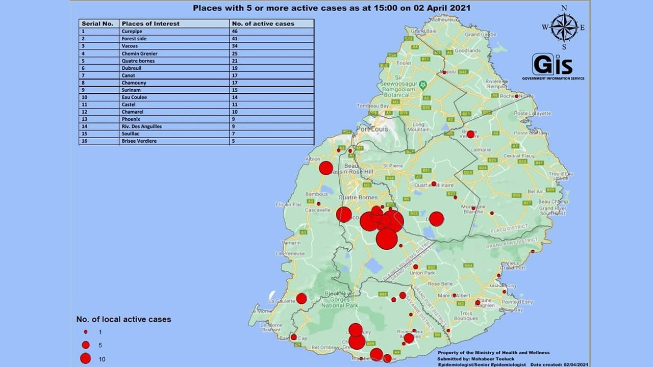 Le Government Information Service a publié sur sa page Facebook une carte de l’île Maurice montrant les régions qui ont enregistré au moins cinq cas positifs à la Covid-19.