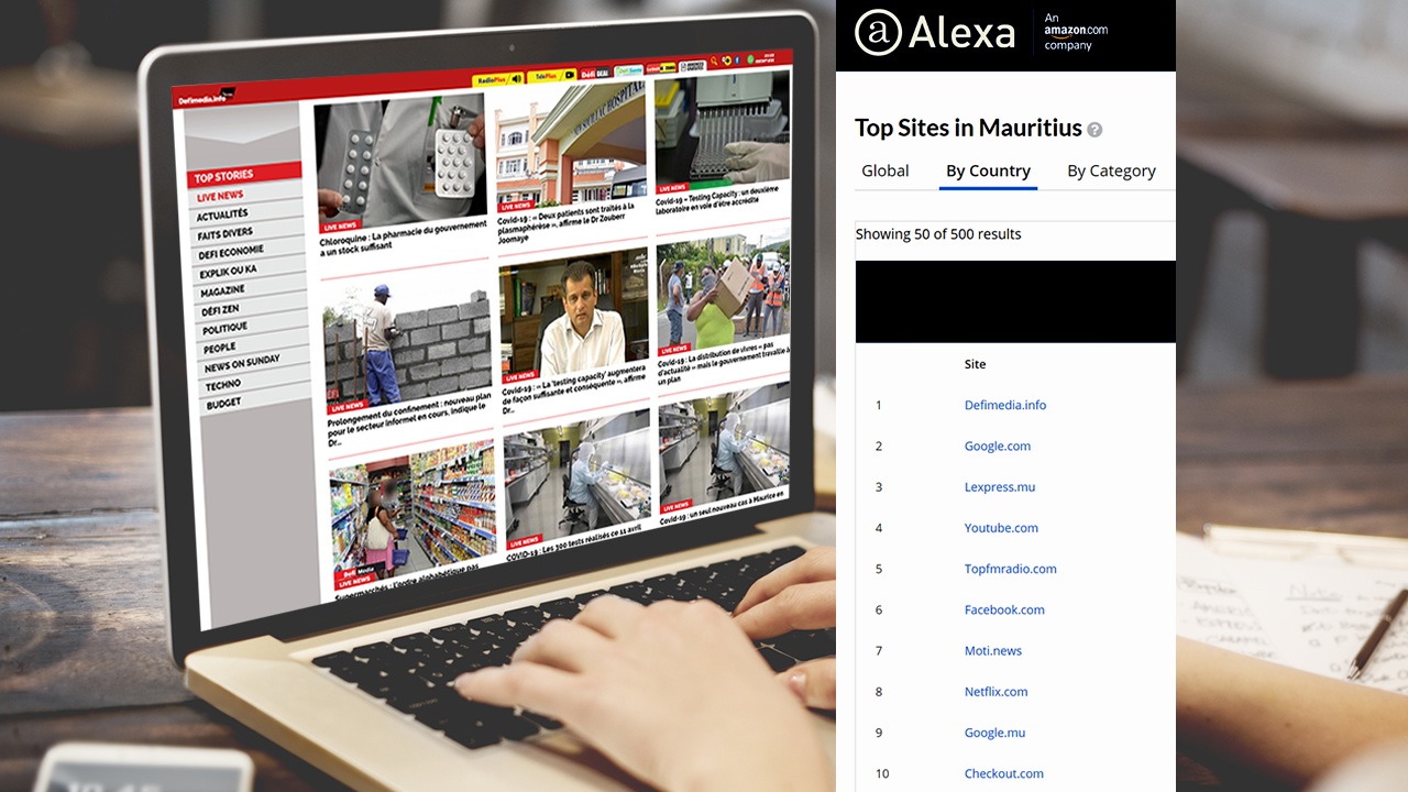 Ce nouveau record a permis à www.defimedia.info de devancer à nouveau de grosses pointures comme Google.com et YouTube dans le classement Alexa, entreprise du groupe Amazon qui fournit des statistiques sur le trafic du Web pour chaque pays et qui fait autorité en la matière. www.defimedia.info est, en effet, depuis quelques jours en tête de ce classement. Lequel comprend des sites locaux et des sites de renommée internationale, qui sont les plus visités à Maurice.