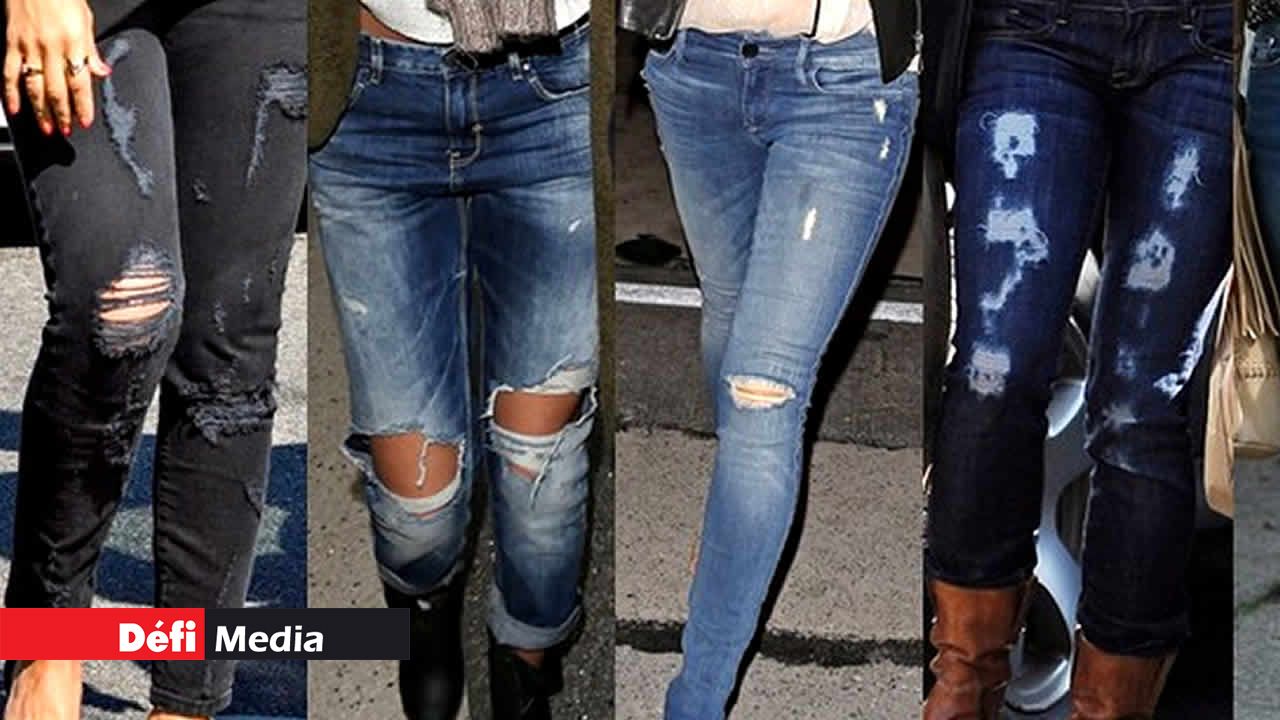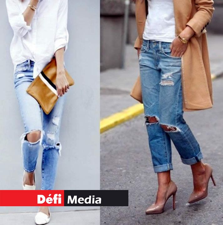 Le look jeans troués et sneakers est aussi un choix osé avec un tee-shirt « loose » ou rock. Parmi les modèles de jeans troués, les plus communs sont les slims, flore et le boyfriend qui se porte retroussé. Pour celles qui veulent déchirer leurs vieux jeans, il suffit de gratter les fibres du tissu avec la pointe de vos ciseaux ou un cutter sur la longueur et faites des déchirures horizontales.