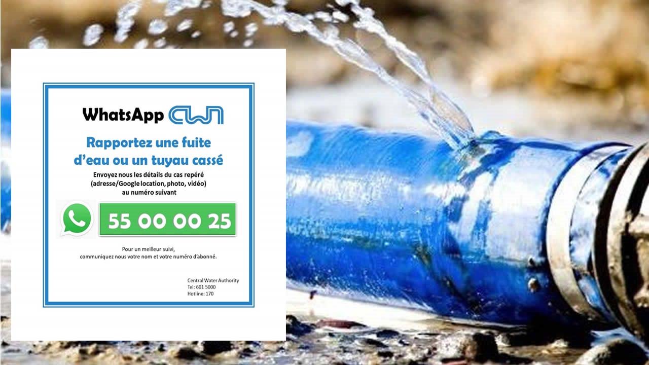 Retenez bien ce numéro WhatsApp : 55 00 00 25. La Central Water Autority (CWA) se met à l’heure des nouvelles technologies. Il est en effet désormais possible d'adresser des plaintes pour des fuites d’eau ou des tuyaux cassés affectant le réseau de distribution dans votre région directement à travers ce numéro WhatsApp.