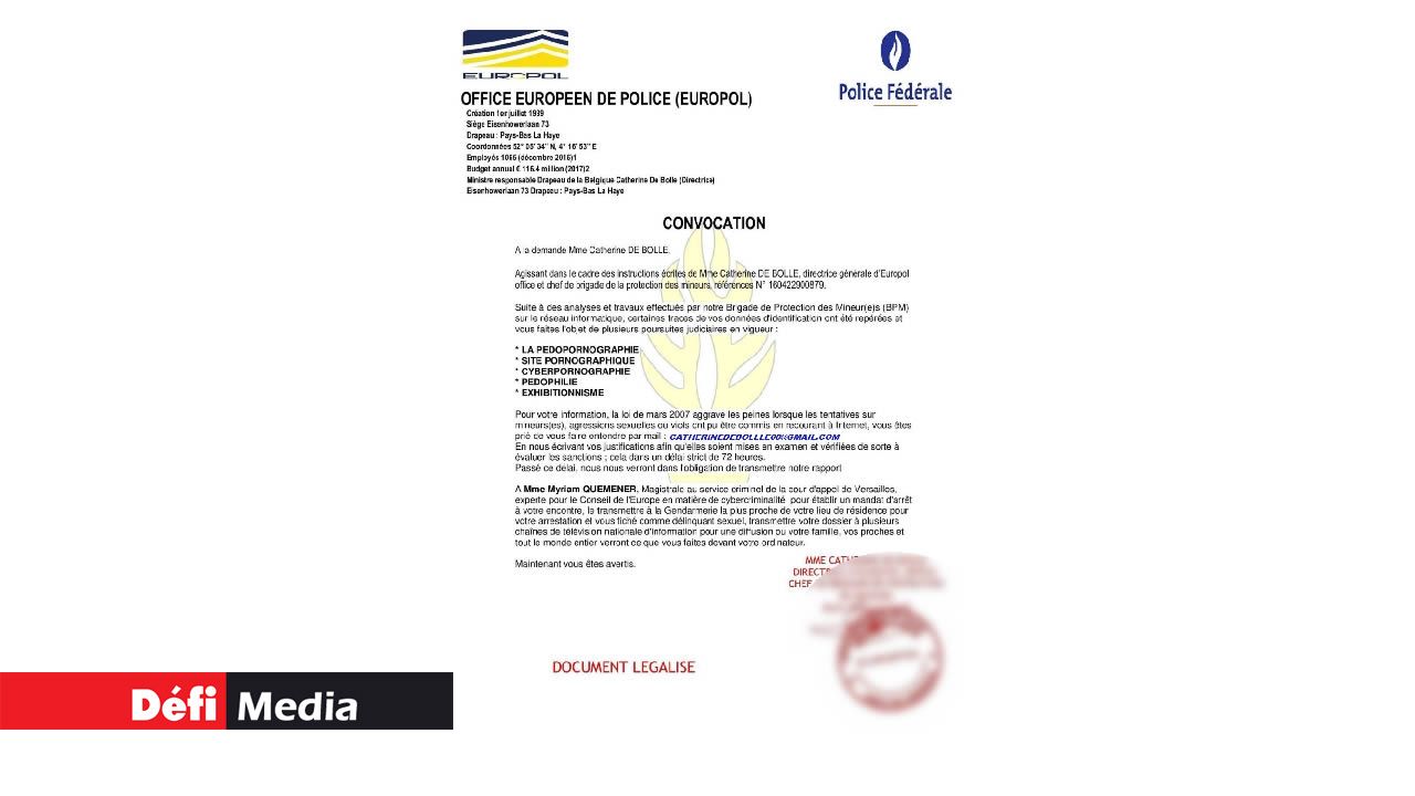 Le contenu est effrayant : vous apprenez que « vous faites l’objet de plusieurs poursuites judiciaires » pour « pédopornographie, cyberpornographie, pédophilie et exhibitionnisme », sur la base d’un traçage de votre activité sur Internet. « Les photos dénudées de vous que vous envoyez aux mineurs ont été enregistrées par notre cyber gendarme et constituent les preuves de vos infractions », est-il indiqué.