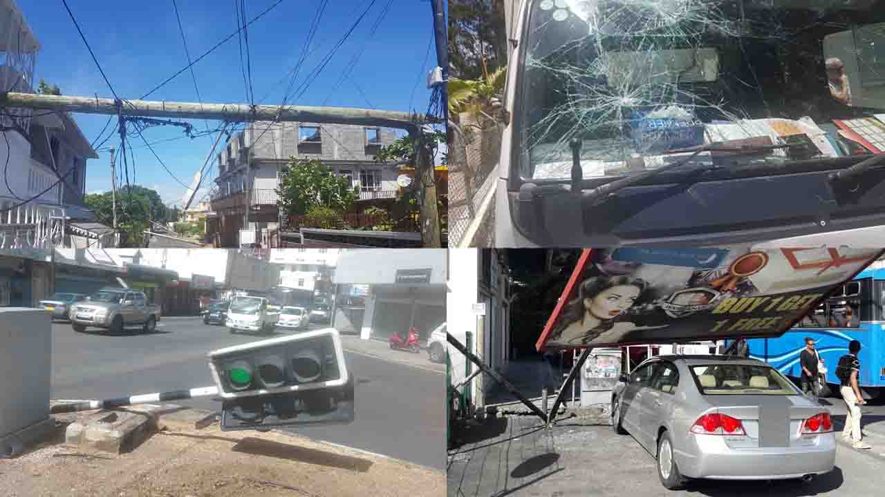 A Bell-Village, un feu de signalisation s'est effondré (comme vous pouvez le voir sur notre diaporama). Toutefois, on ne sait pas pour l'heure si c'est à cause des rafales ou s'il a été percuté par un véhicule. A Quatre-Bornes, un panneau publicitaire s'est effondré devant l'hypermarché Intermart.