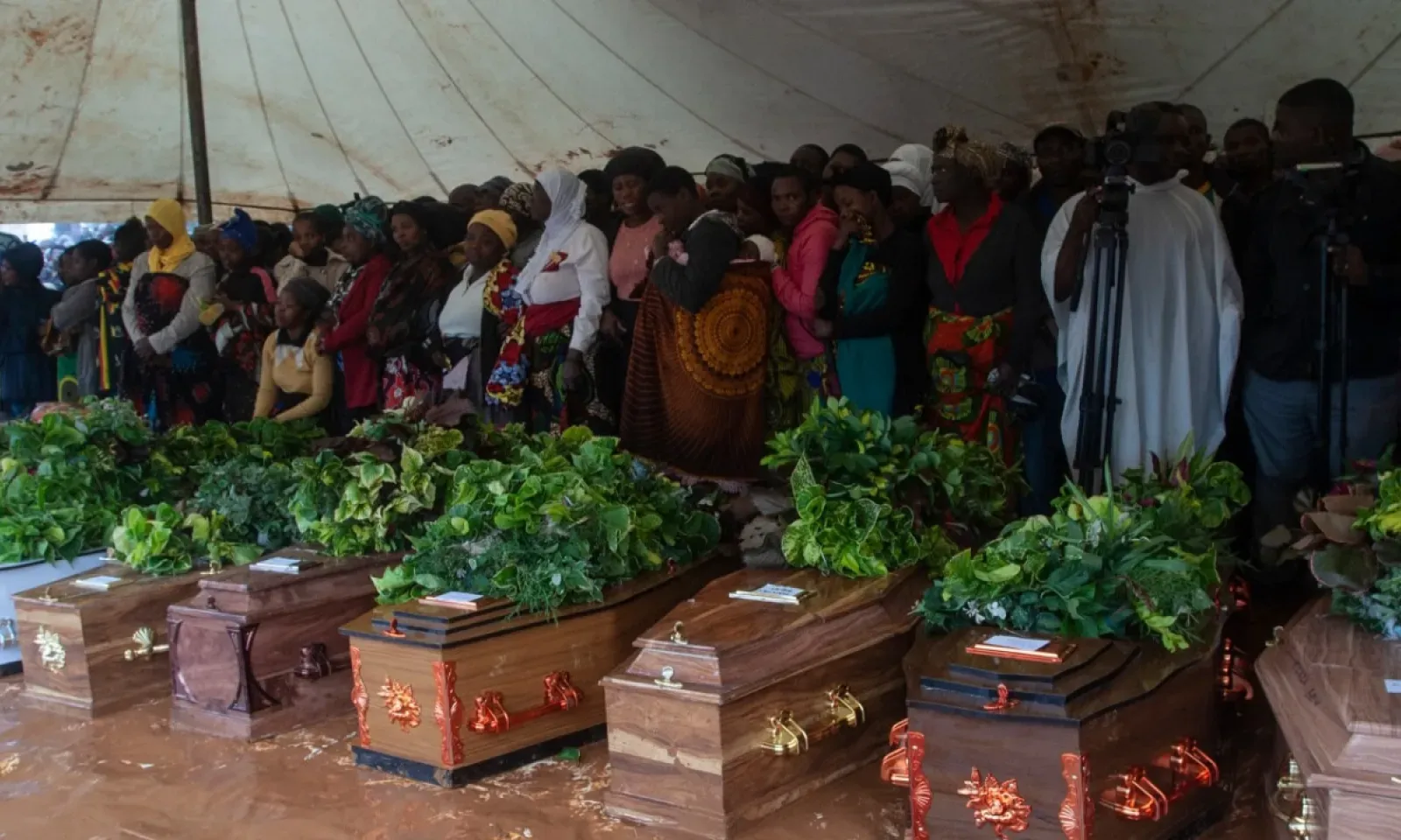 Des dizaines de personnes en deuil étaient présentes au rassemblement organisé dans une école du township de Chilobwe, près de Blantyre. Vingt-et-un cercueils ornés de couronnes de fleurs étaient alignés sous une tente, protégés de la pluie fine et continue.