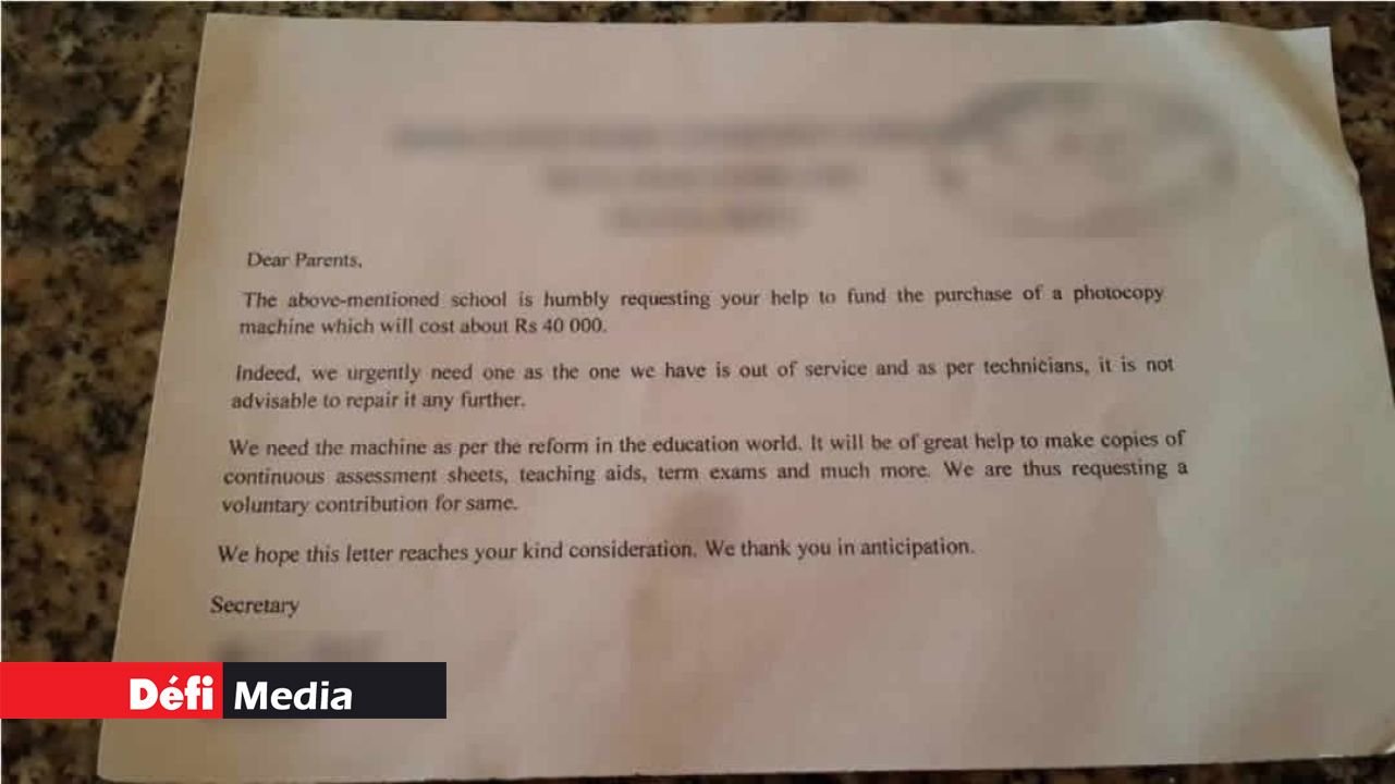 Il ne mâche pas ses mots. Ashraf B., 49 ans, est révolté. Il a reçu une lettre de l’école primaire que fréquente son enfant dans laquelle la direction de l’établissement scolaire, situé dans le Nord, demande aux parents d’élèves de contribuer pour l’achat d’une photocopieuse. Le prix de celle-ci s’élève à Rs 40 000.