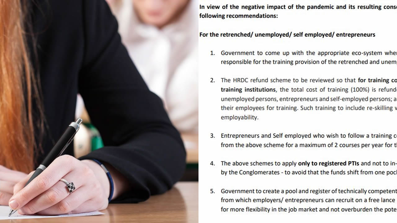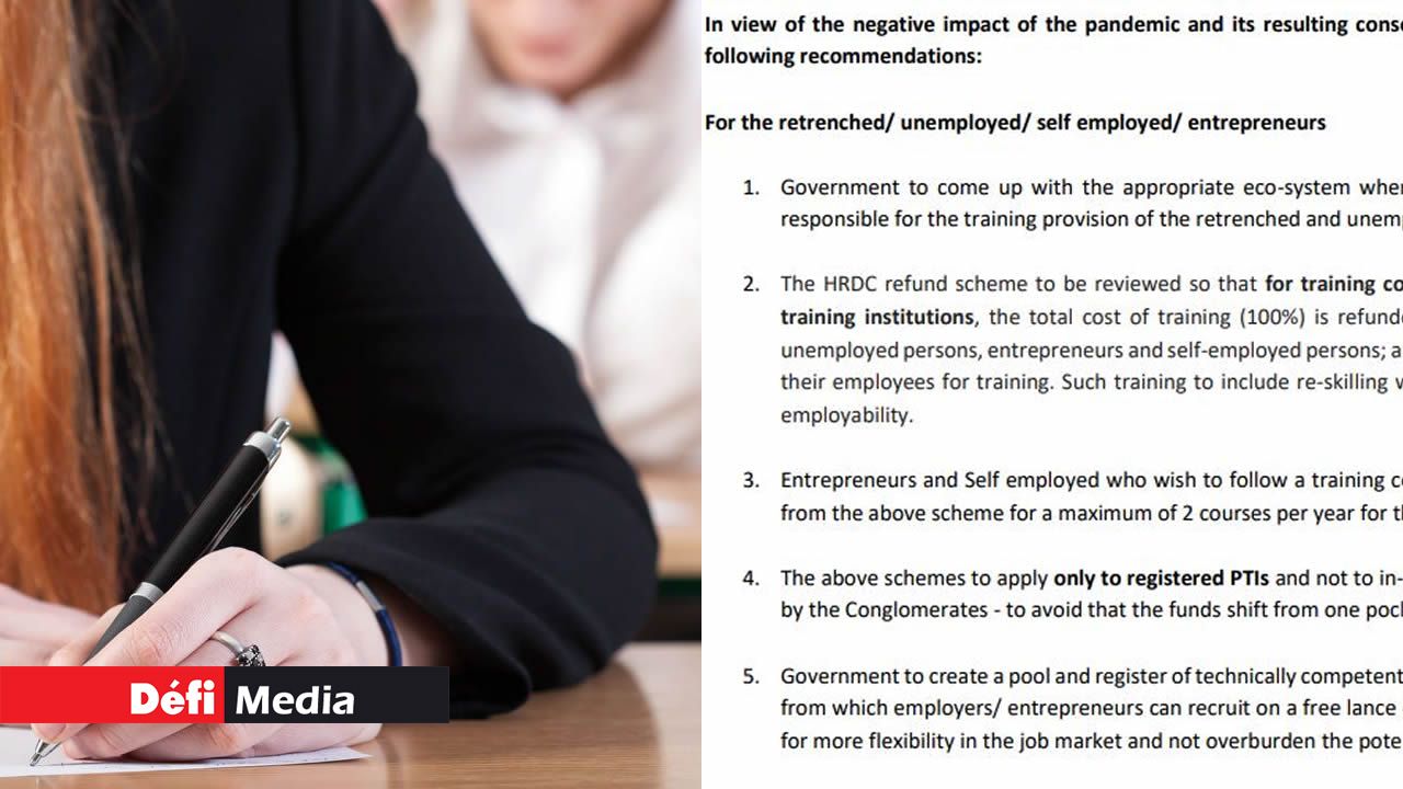 Parmi les propositions faites dans cette lettre ouverte, l'Association of Registered Private Training Institutions souhaite que : «The HRDC refund scheme to be reviewed so that for training conducted in registered private training institutions, the total cost of training (100%) is refunded for retrenched employees, unemployed persons, entrepreneurs and self-employed persons; and 90% to employers who send their employees for training. Such training to include re-skilling with a view to enhance overall employability. »