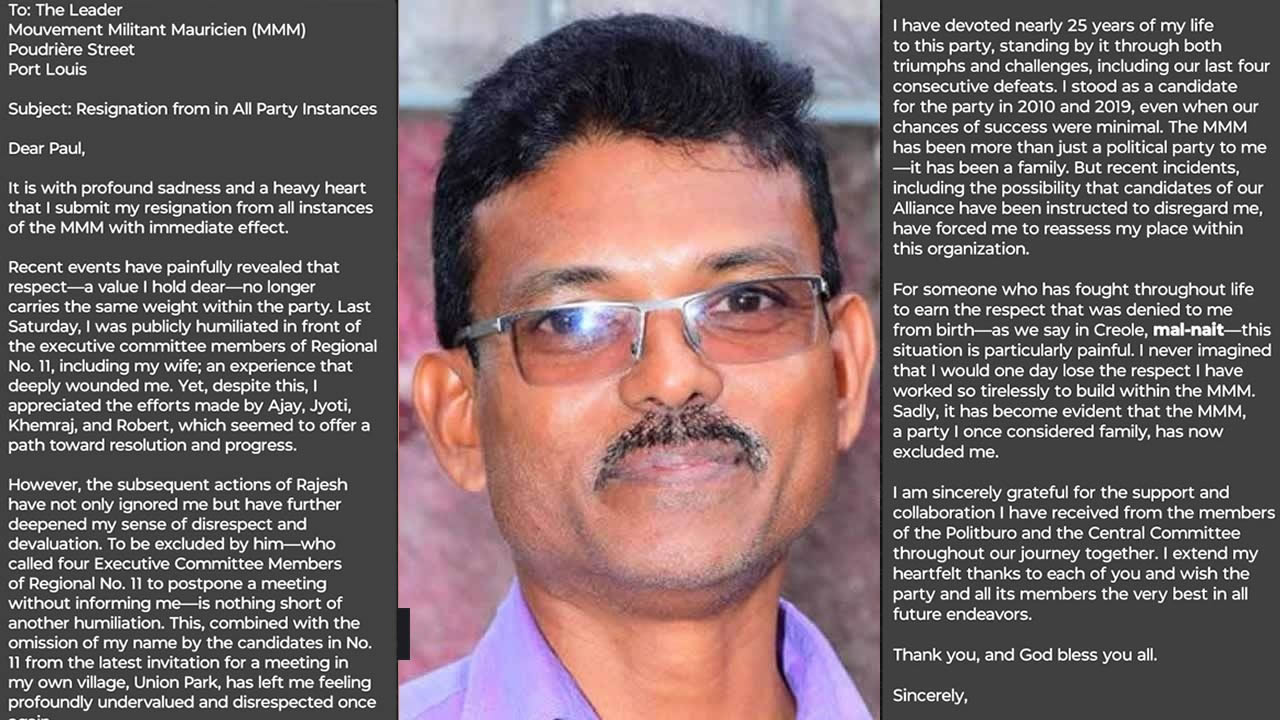 Dave Kissoondoyal ne fait plus partie du Mouvement militant mauricien (MMM) et de ses instances. L’ancien membre du Bureau politique (BP) et ex-assistant trésorier du parti précise avoir envoyé sa lettre de démission au leader des mauves, Paul Bérenger, au secrétaire général du parti, Rajesh Bhagwan, ainsi qu’au Deputy Leader, Reza Uteem. Il a également partagé sa lettre de démission sur le groupe WhatsApp du BP du MMM.