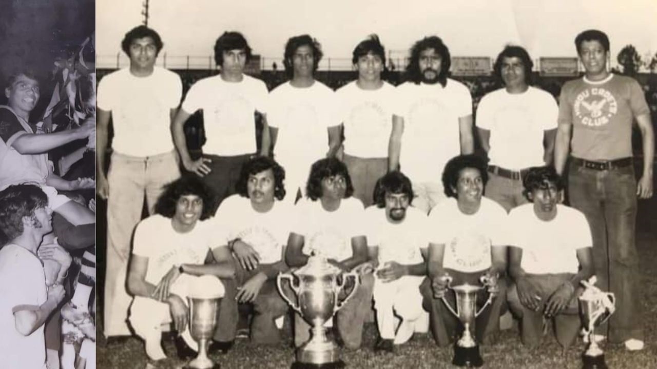 Vavel Armoogum recevant un trophée et l'équipe des Hindu Cadets des années 70. (Crédit photos : Page Facebook Cadets Club)