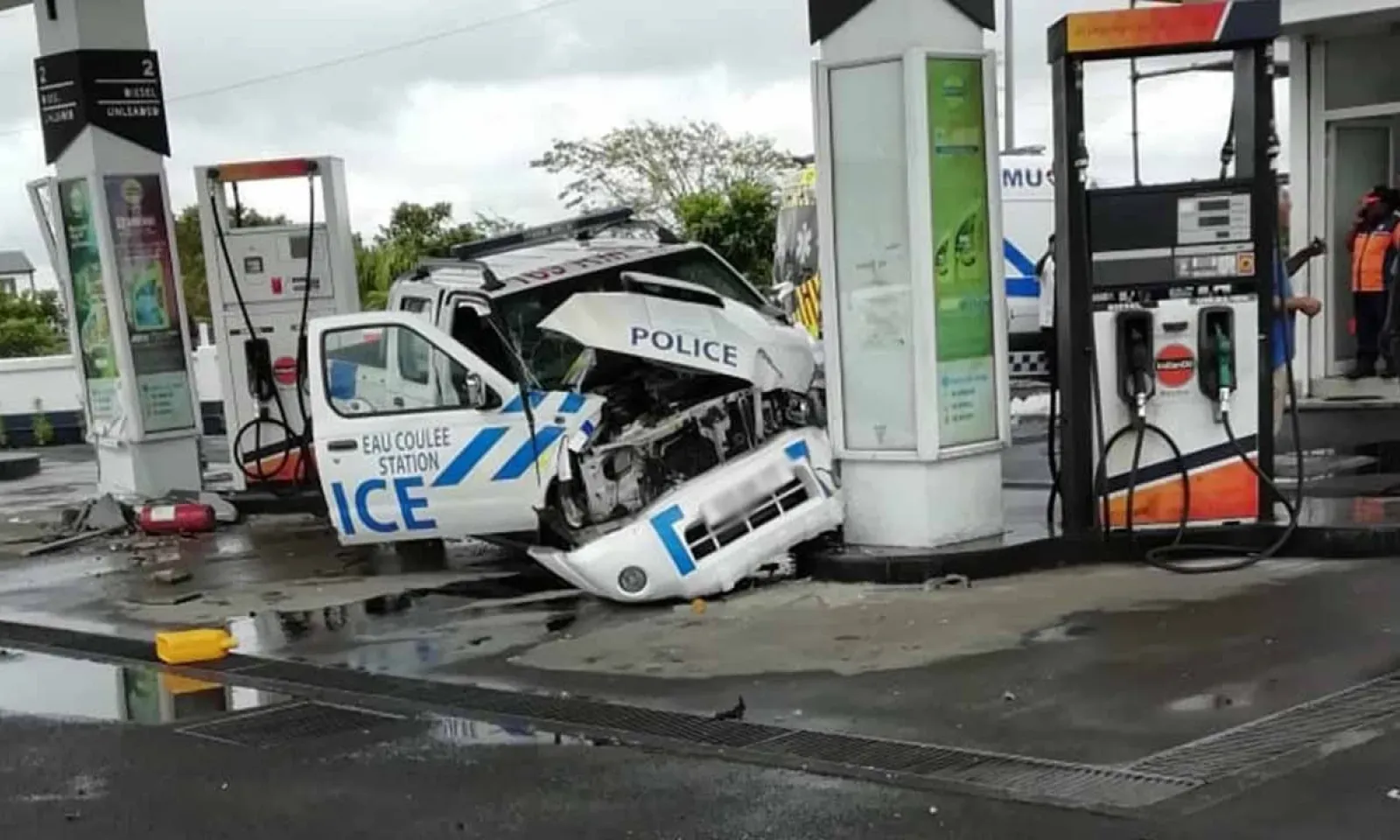 Les circonstances de l’accident sont toujours inconnues pour l’heure. Selon nos recoupements, c’est le commissaire de police Mario Nobin qui supervise personnellement l’enquête sur cet accident impliquant un véhicule de la police d’Eau-Coulée. Le 4x4 a fait une sortie de route avant de terminer sa course contre une pompe à essence après avoir percuté deux pompistes.