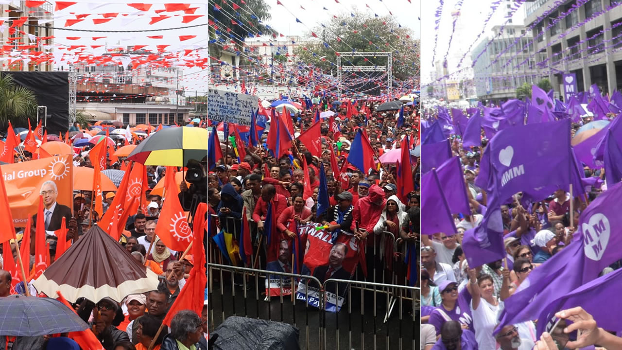 La campagne électorale atteint, ce dimanche, son apogée avec son unique bataille des foules entre les principaux protagonistes – l’Alliance Morisien (MSM-ML), l’Alliance Nationale (PTr-PMSD) et le MMM. Comme à l’accoutumée, ils n’ont pas lésiné sur les moyens pour attirer la plus grosse foule dans cette bataille purement psychologique.