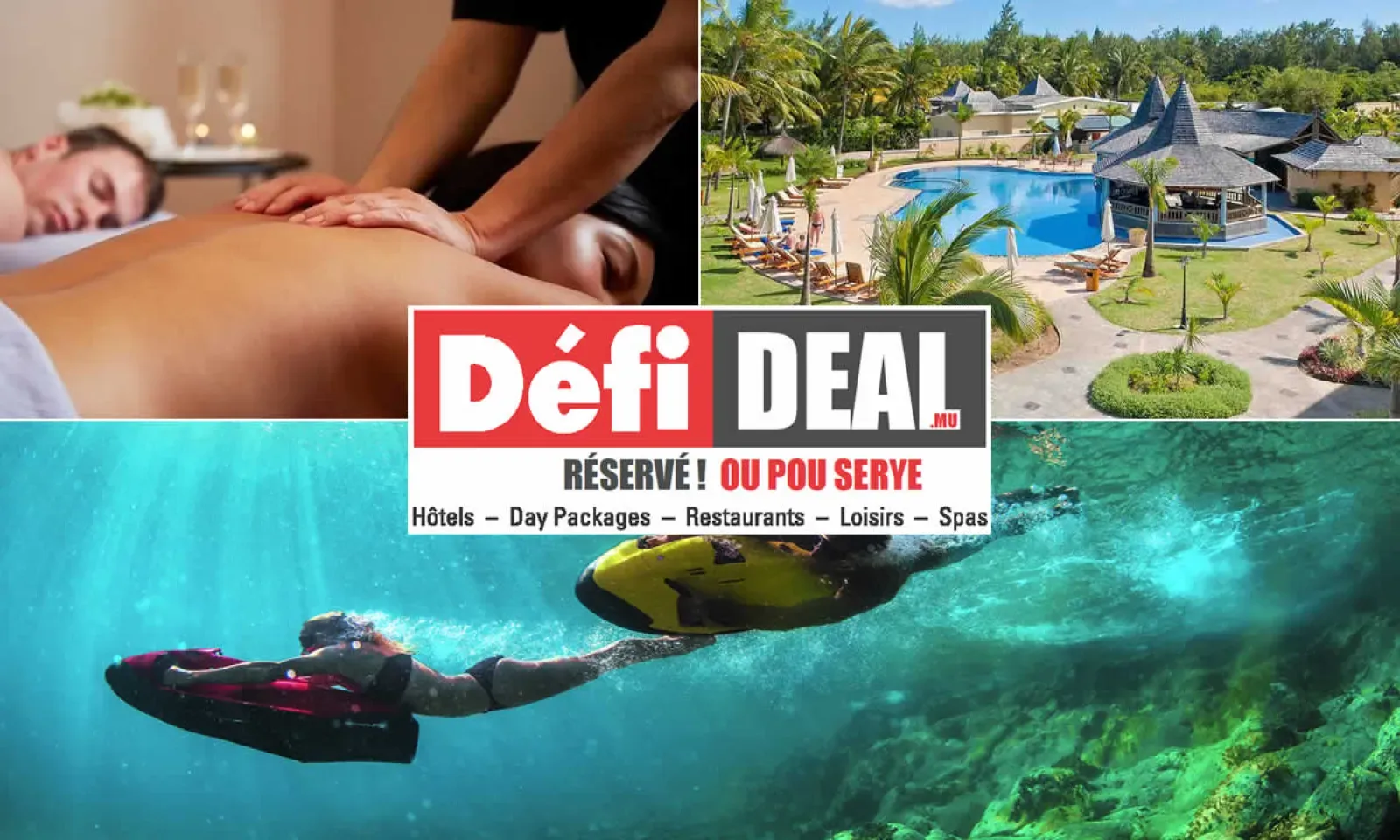 Défideal, une plateforme de réservation en ligne, permet aux Mauriciens et aux résidents de bénéficier des offres exceptionnelles sur diverses prestations. Notamment des hôtels, des activités terrestre et aquatique, des soins de bien-être et de beauté et des restaurants. Pour en profiter, il suffit de se connecter au www.defideal.mu ou d’appeler le 210 5300 pour de plus amples renseignements. Cette semaine, découvrez :