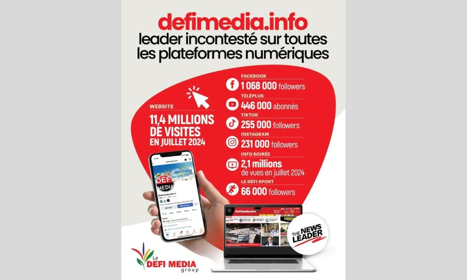 Avec 1 068 000 followers sur sa page Facebook, 11, 4 millions de pages visitées sur son site Web en un mois, 446 000 abonnés sur YouTube via la chaîne TéléPlus, 255 000 followers sur TikTok et 231 000 followers sur Instagram, defimedia.info demeure le leader incontesté sur toutes ces plateformes dans la catégorie des médias. C'est ce qui ressort des données fournies par Google Analytics, Meta (Facebook et Instagram), YouTube Analytics et TikTok pour le mois de juillet 2024.